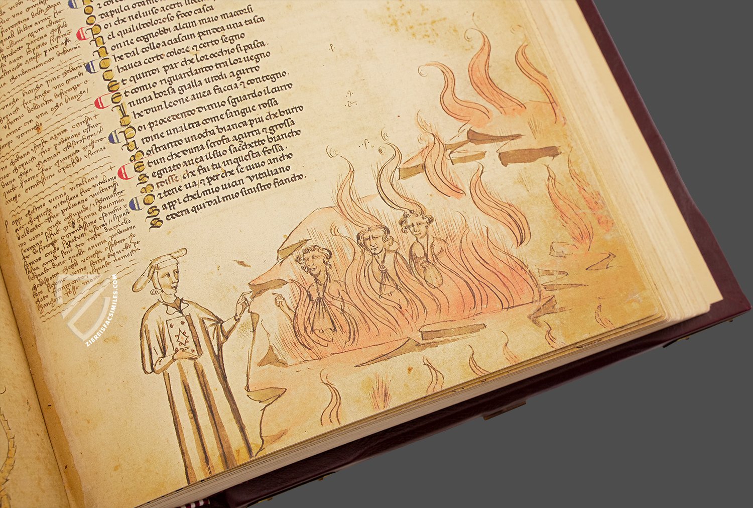 Although it appears that one hand transcribed Danteβs original text, the dΓ©cor was the work of at least four artists. The Inferno was illustrated by two miniaturists who worked at the time the codex was prepared, decorating it with lively, realistic figures with strong emotional intensity. On the one hand, they convey Dante's inventive power, while on the other they reflect the typically medieval obsession with the evil and diabolical, expressed by the infernal demons scattered throughout the pages. The illustrations of Purgatory and Paradise, on the other hand, were completed by two skilled illustrators who, towards the end of the 15th century, continued the work of the illuminators by decorating the last two canticles with a series of watercolor vignettes, characterized by a graceful stroke, soft colors, and images of strong didactic evidence.