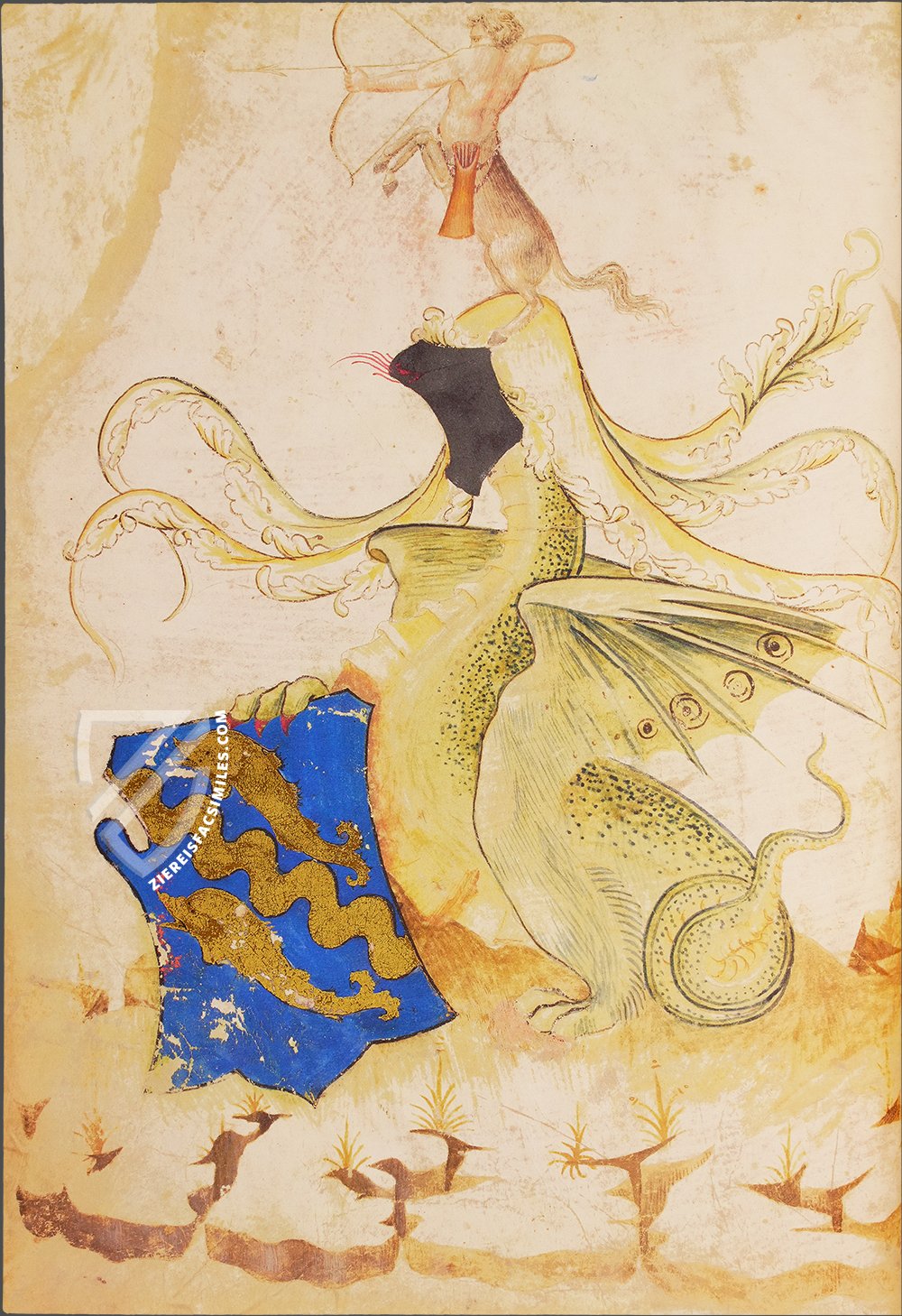 The original owner is unknown, but the manuscript was written on paper instead of parchment, pointing to a patron who had a budget. Sometime in the next two centuries, a parchment sheet was inserted into the beginning of the book opposite the first page of text with the coat of arms of a yet-unidentified family. It consists of two golden dolphins separated by a wavy band of gold on a field of blue and is held up by a green dragon whose face is hidden by a black helmet. On top of its head, a centaur stands on its back legs with its bow drawn. After the manuscript was acquired by Cosimo deβ Medici, he had it rebound with embossed red leather over wooden boards with a central medallion and metal corner-pieces bearing the Medici arms surmounted by the grand-ducal crown and flanked by the initials C and M. This was done in preparation for the opening of the Laurentian Library to the public on June 11, 1571 β the Grand Duke's birthday.