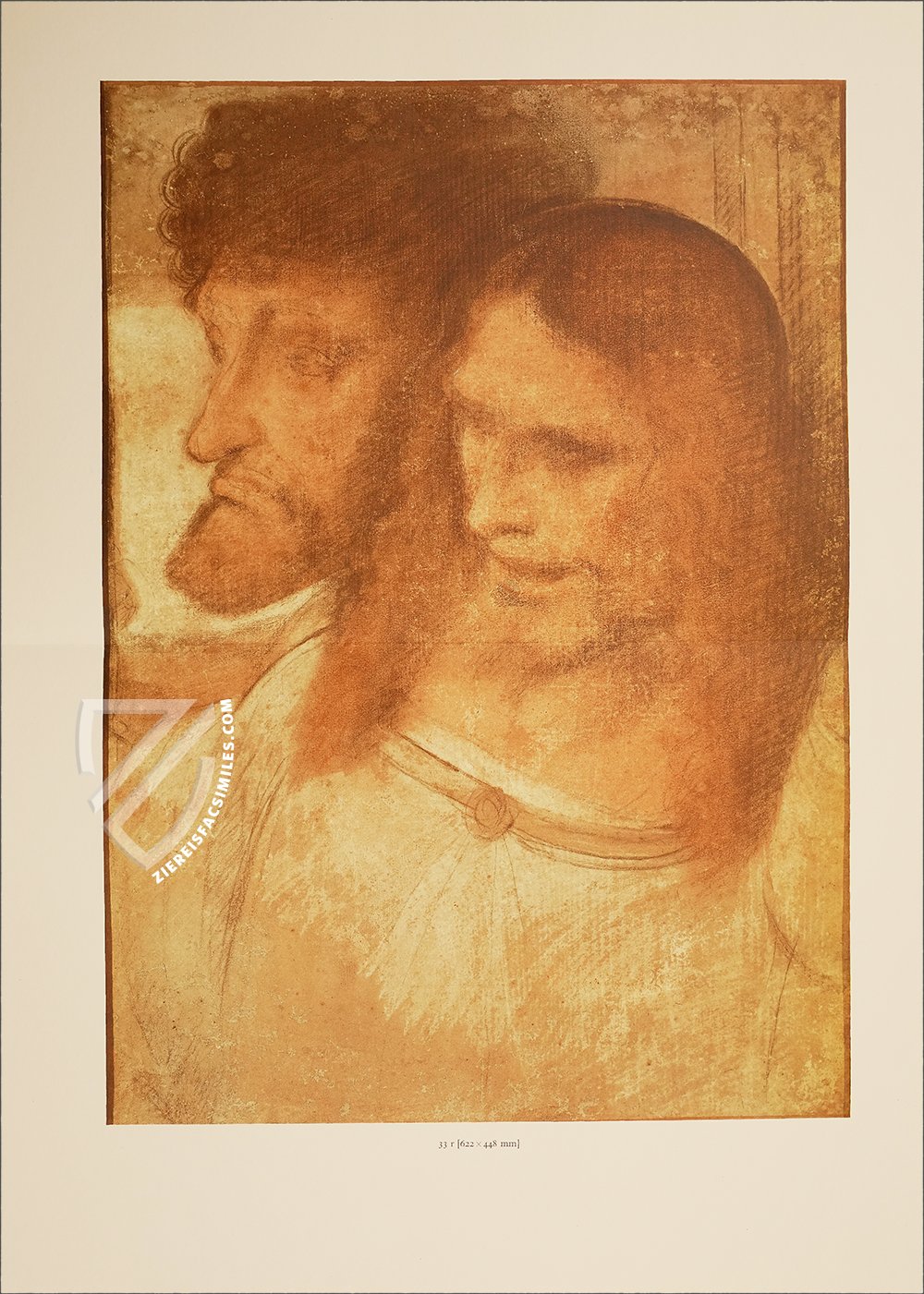 80 boards with 200 drawings altogether visualize the entire spectrum of this significant art-historical aspect of the Italian Renaissance. 15 drawings of Leonardo from his own hand – eight of which are from the Metropolitan Museum of Art in New York – give an inside view into Leonardo’s studies of the famous Milanese Last Supper (originating 1495) inter alia and in his work with human physiognomy. The compendium additionally contains the complete series of caricatures from the Spencer Collection of the New York Public Library: 104 exact copies of the now-lost 16th century originals by Leonardo da Vinci!