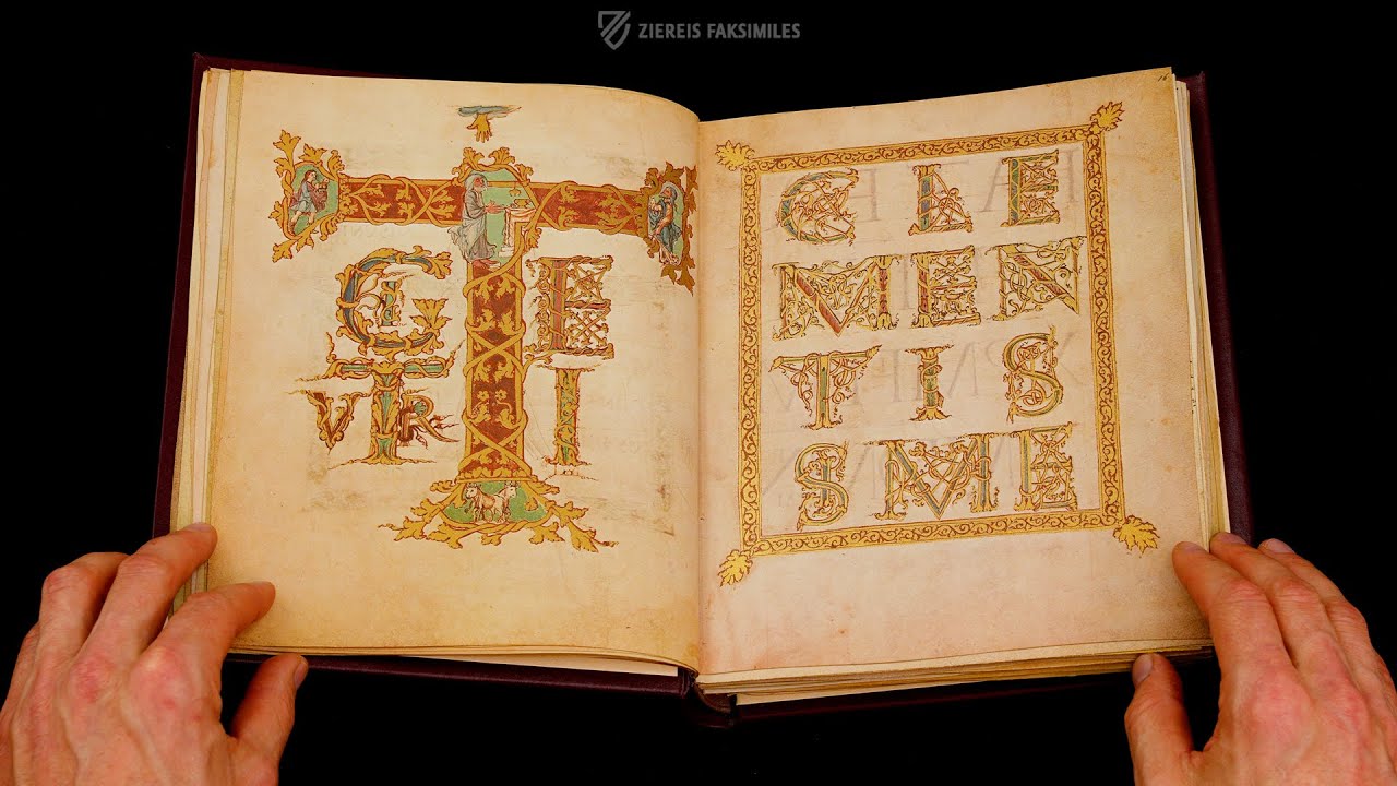 The ornamental decoration of the sacramentary boasts richly embellished initials in correlation with the text. When simply decorated, they consist of golden foliage and rinceaux winding around the body of the letter. The larger letters and sumptuous initial pages, however, are in direct reference to the contents of the text they precede. They depict incidents in the lives of Christ and the saints and are elaborately ornate with classical forms, such as vines, architectural elements and playing Eroses. In close relation with these initials are the ivory reliefs on the binding, which protect the original manuscript and are reproduced in the commentary volume of the facsimile edition. They repeat some of the scenes shown in the miniatures, including the same architecture and some persons in the same posture, wearing the same clothing.