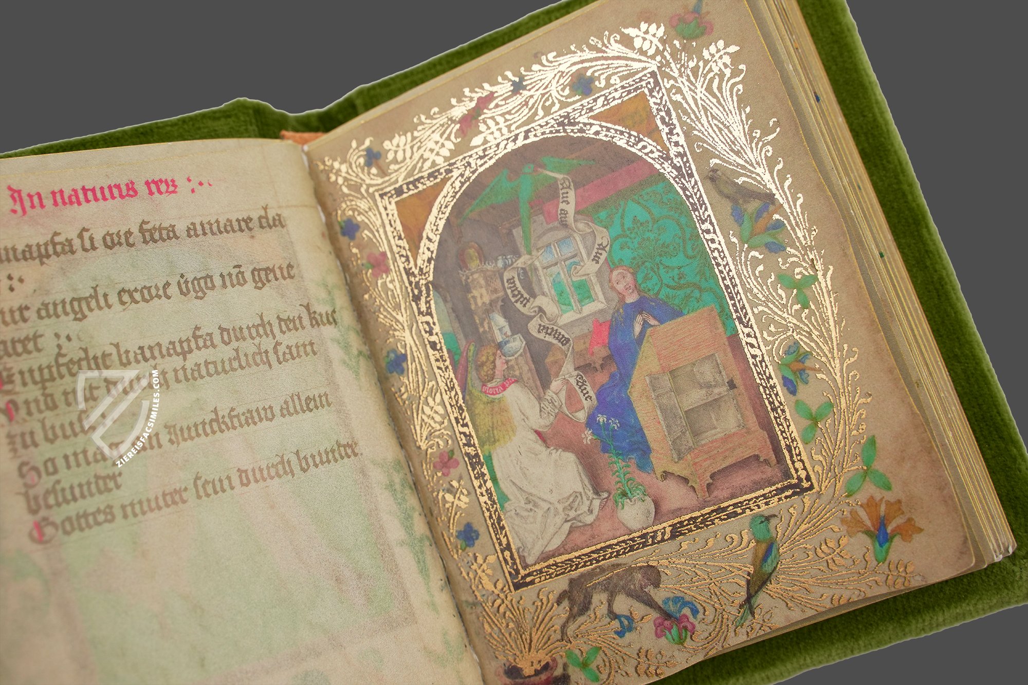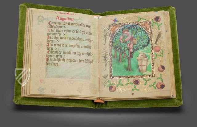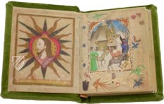 The 15th century manuscript by the Dominican and theologian Franz von Retz attempts to document the wondrous occurrence and curious story of the wonder of the Immaculate Conception of Mary. This entertaining text is illustrated with numerous lovingly shaped miniatures in the style of Stephan Lochner. A fantastic world of enormous imaginative power is shown in light, colorful pictures imbued with costly gold leaf.