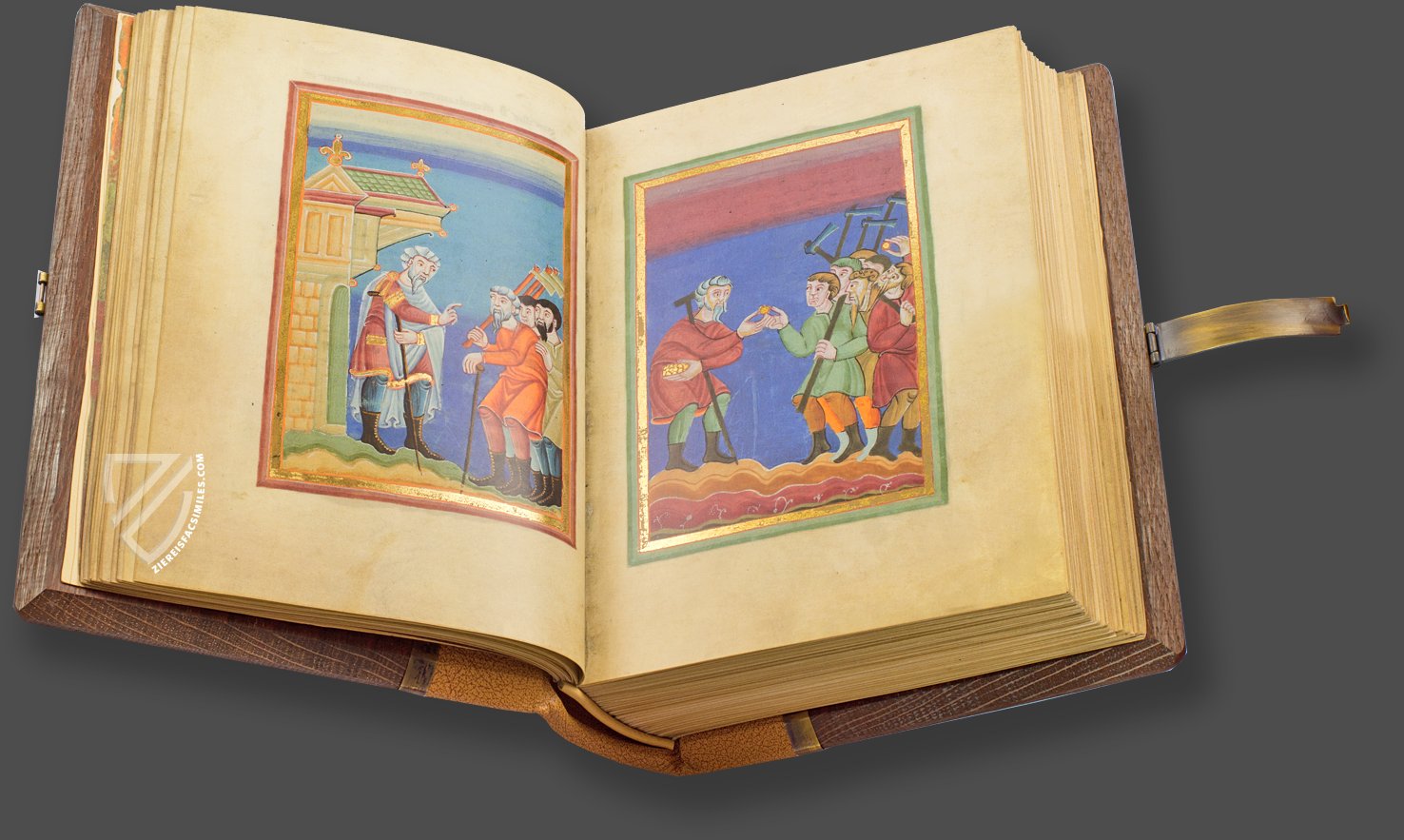 A few details of the corpus are especially worthy of note, which one could say mark a revolution of monastic book making. The Annunciation to the Shepherds is a distinctive feature. The scene was not treated as a part of Christ’s birth, as had been previously done, but stood instead as its own extensive and cohesive miniature. Luminous colors were chosen, which interact brilliantly within golden framing. Furthermore, it features the first picture cycle concerning the story of St. Stephen, which depicts the excavation work done by the common people, i.e. the search and discovery of the martyr's bones. Astonishingly exact pictures show workers with hammers and shovels, vintners who were paid for their services with gold pieces, and further everyday scenes from medieval life that were previously never held to be worthy of depiction. The Echternach Pericopes, with this sprawling diversity of stories and richness of illustration, created something to inspire the beholder to this day.