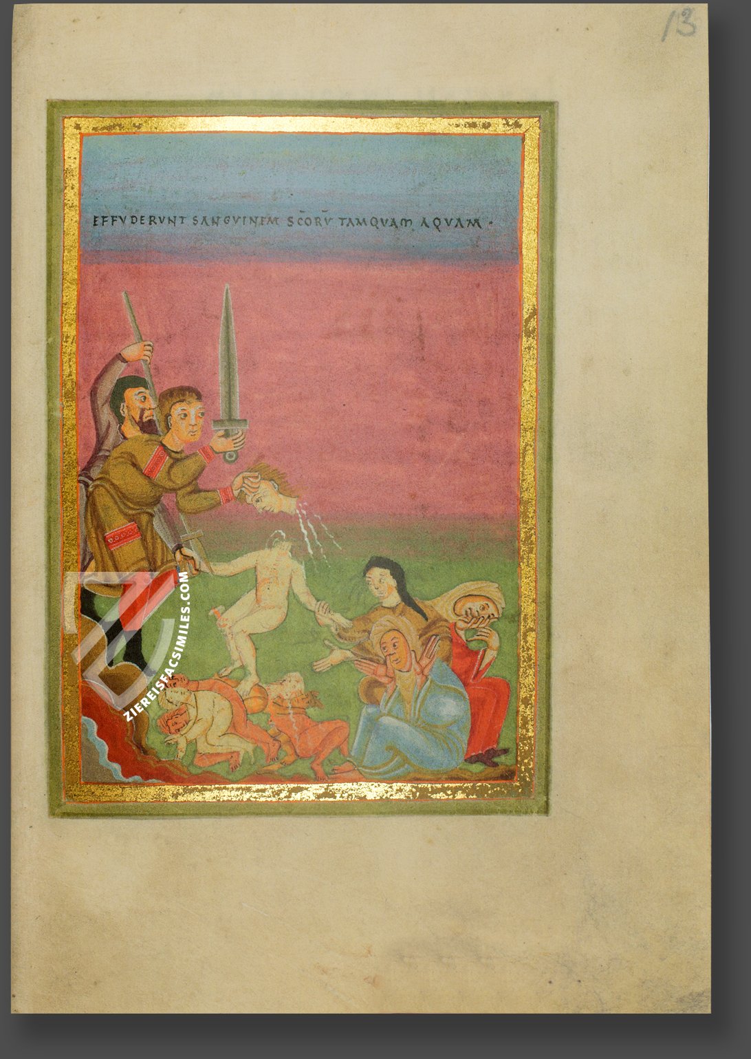 The monks of Echternach shied away from neither cost nor labor for the numerous decorations of the manuscript. The corpus begins with a true masterpiece of miniature painting. A full-paged depiction of the Maiestas Domini, the beloved image of Christ on his throne surrounded by four symbols of the pericopes, was painted in the charmingly simple color scheme of kingly purple and gold. Following this work of art are the portraits of the four evangelists and a few depictions of other saints, for which nonetheless no luxurious gold elements were spared. In total one finds 41 illustrations decorated with gold, 13 richly appointed pages of text, and more than 250 bold multiline initials in the codex.