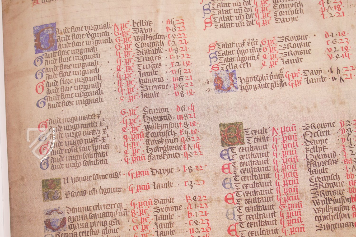 One of the greatest collections of Latin choir music to survive the English Reformation originated at Eton College between 1490 and 1501. The Eton Choirbook contains 64 compositions on 260 surviving pages, which include nine Magnificats, a Passion, and 54 motets, which were primarily sung in the evening after the prayer to the honor of the Virgin Mary. Pieces from 24 composers are assembled in the cultural artifact, whereby the Englishman John Browne (1453-ca. 1500) is represented most often. Charming initials are distributed throughout the entire manuscript, which gentrify the otherwise unostentatious choir book.