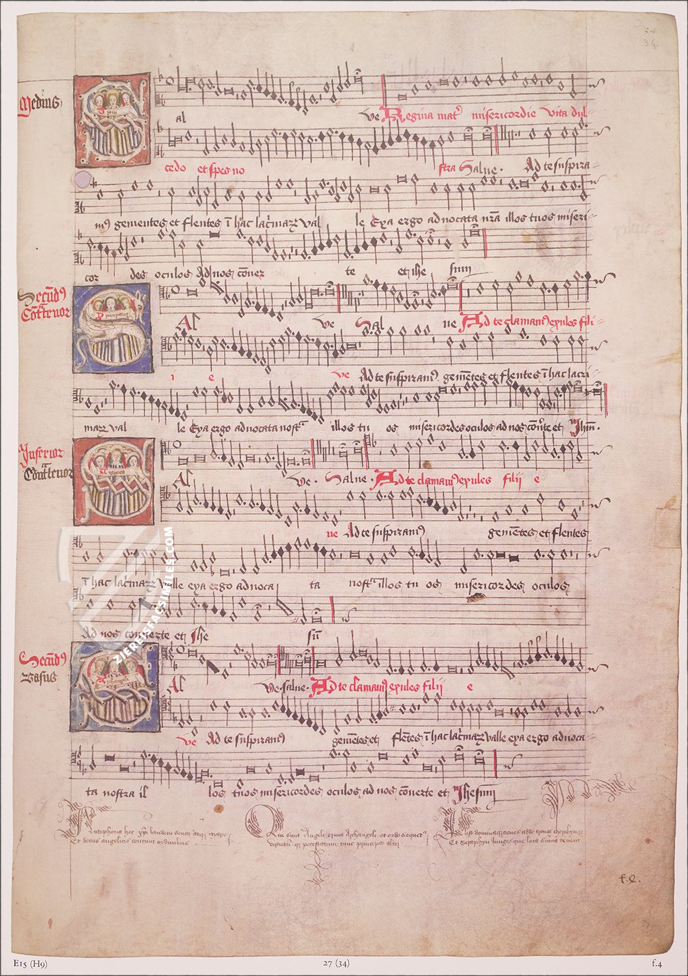 This antiphon dedicated to the Virgin Mary was sung from Pentecost until Advent and was especially dear to sailors. It is also one of the few compositions in this historically significant musical manuscript to be adorned with a golden historiated initial and was written by Walter Lambe, identified here as βWalteusβ. The leafy βPβ initial contains the Lamb of God resting on a book and a bearded figure with a halo, probably John the Evangelist considering that an eagle is also depicted.