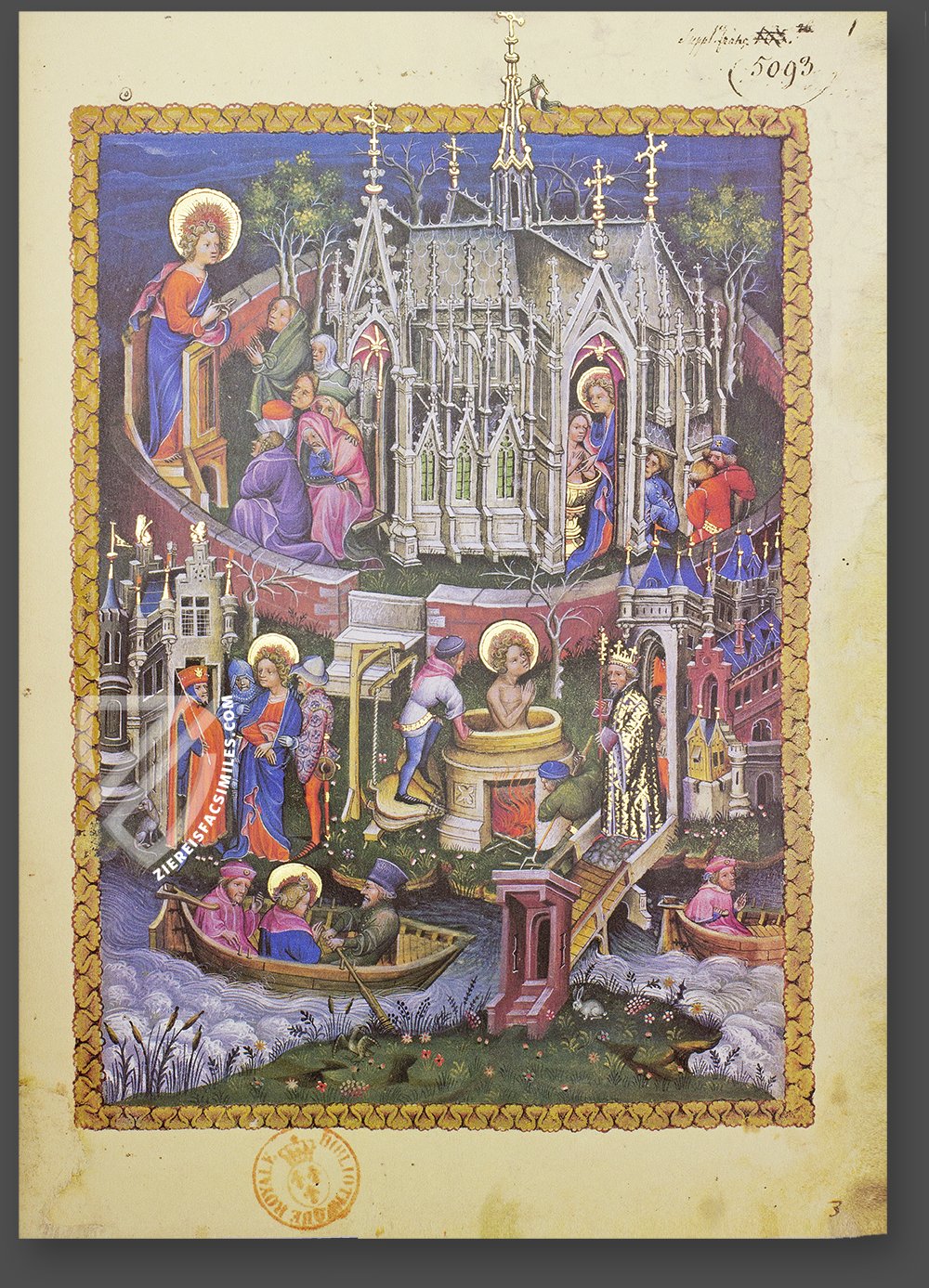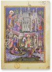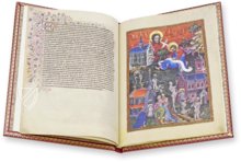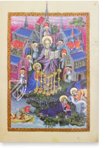 The helmsman in a red hood from the previous miniature is seen pushing off after having brought John to the island of Patmos. John is lying down as an angel brings him an empty scroll on which to write his Revelation. The seven churches of Asia are represented by Gothic buildings in a semi-circle around Christ with John kneeling at his right hand.