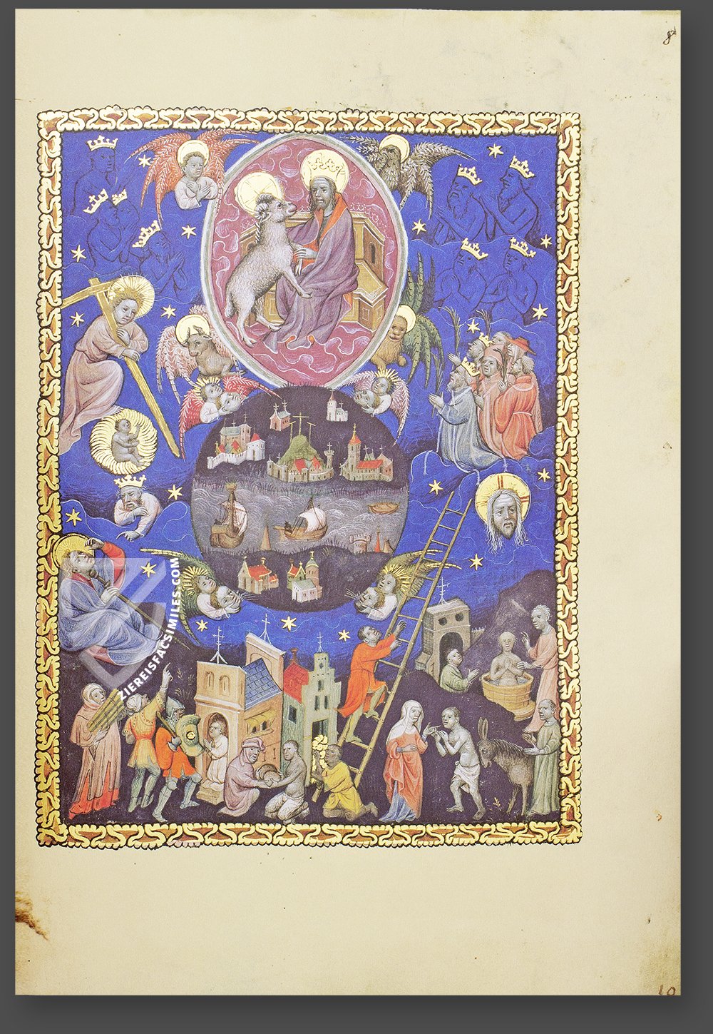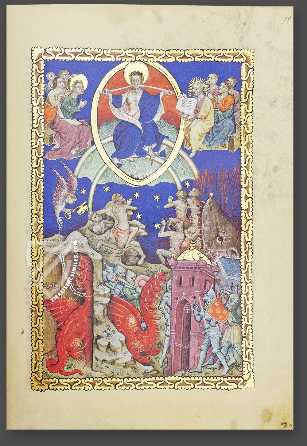 The Book of Revelation, referred to as the Apocalypse during the Middle Ages, was one of the most popular texts chosen for illuminated manuscripts because the incredible, fantastic, and often terrifying events is describes allowed artists to explore the very limits of their ability. Marking the transition from Gothic to Renaissance art, the so-called Flemish Apocalypse arose between 1400 and 1410 in Belgian Flanders, which was one of the most important centers of the manuscript production at the time, is now in the National Library of France. The anonymous illuminator created 23 exquisite full-page illuminations for the manuscript, which carry the viewer away into gold-adorned, visionary dream worlds. While reflecting the traditional style of Apocalypse manuscripts of the time, the magnificent pictorial works also contain unique new stylistic characteristics and artfully illustrate the mysterious atmosphere of the biblical text.