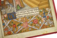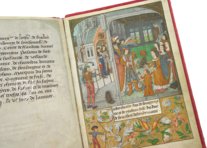 This dazzling Flemish Chronicle on the history of the Burgundian duchy probably originated between 1485 and 1490 and was intended to be a schoolbook for Philip the Fair (1478-1506). The later Duke of Burgundy and first Habsburg to become king in Spain was to be educated about the historical events of the 14th and 15th centuries by means of the text and at the same time understand the importance of his family through the splendid depictions of his ancestors. Eleven splendid full-page miniatures with explanatory captions show, for example, the legendary Burgundian King Stephen of Burgundy, Charlemagne and Mary Magdalene in noble courtly scenes, in the dramatic turmoil of war or in front of authentic cityscapes. The so-called Master of the Trivial Heads was responsible for the artistic and meaningful illumination. He was probably hired by Philip's teacher, Olivier de la Marche, who in turn had himself immortalized in a portrait within the manuscript.