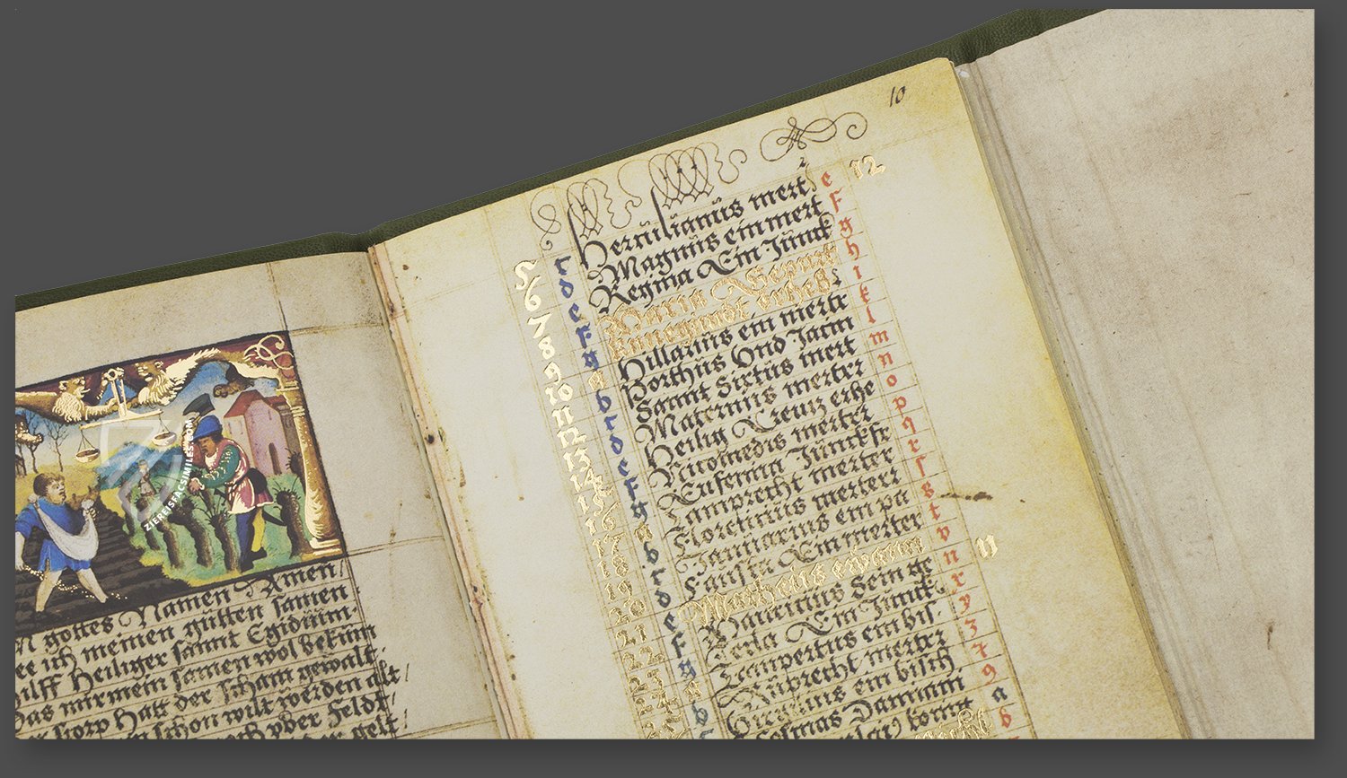 The Nuremberg miniaturist Albrecht Glockendon created a wonderful gem of 16th century illumination with his Golden Calendar of Albrecht Glockendon from 1526. His 16-page astrological text with an everlasting calendar assembles a wonderful miniature for each month and the small book concludes with astrological tables and references, e.g. for bloodletting or calculating church holidays during the year. Decorative miniatures with scenes from everyday life are adorned with zodiac signs as well as floral and ornamental elements in the most luminous colors and with the lavish application of gold leaf.