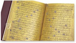There are only a few copies of the Qur'an in existence that were produced on a colored writing surface, such as the Blue Qur'an by Kuli or copies of Qur'an pages colored with saffron or purple. The Qur'an presented here, however, is the only copy of its kind in the world: it was written on gold-coated paper in black Naskhi script. This script is based on mathematical calculations from the 10th century and is the reason why the characters appear so distinctively even. Its unit of measurement is the alif, the first letter of the Arabic alphabet. The script was used by two famous calligraphers in the 11th century. Among a number of other features of the Gold Qur'an, it enables its attribution to the renowned calligraphic school of Ibn al-Bawwab (d. 1022).