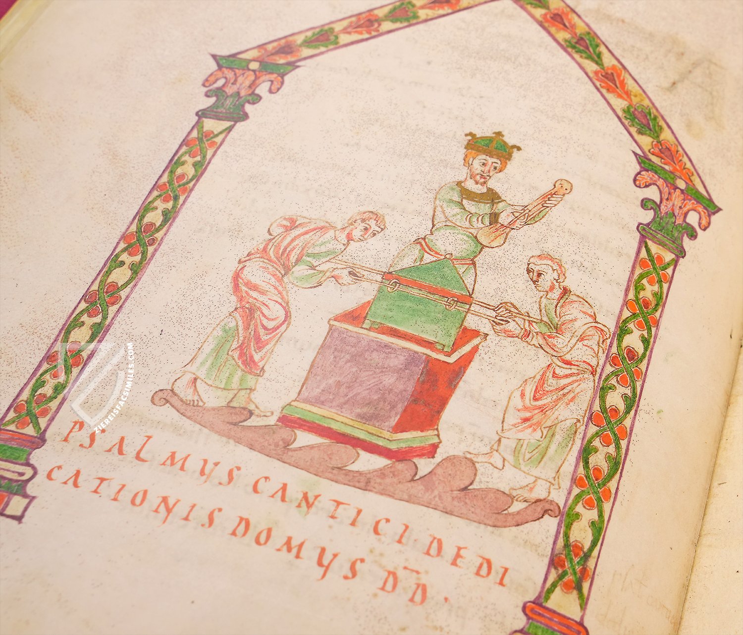 The 17 miniatures, nine of which take up an entire page, were also added in St. Gall. The protagonist of the mostly narrative images is King David, who was not only known as the king of the Israelites and the conqueror of Goliath, but was also attributed the authorship of the Psalms in the Middle Ages. Thus, most of the illuminations depict scenes from David's life. The elaborate late Carolingian painting is characterized both by reminiscences of antiquity and by two-dimensional figures with strong facial expressions and gestures and a vivid color palette dominated by purple, minium, green, and gold. Many of the Old Testament figures are also striking for their Frankish garb, which places them in the time of the Psalter's creation, giving us today a captivating glimpse into the world of the Carolingian early Middle Ages.