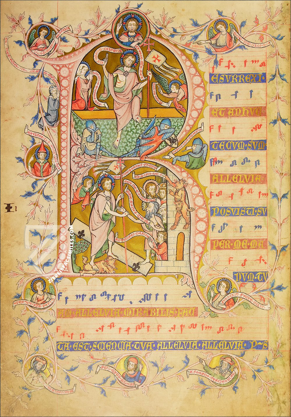 In its upper half, the initial shows the resurrected Christ in his special union with God the Father, who calls him to resurrection on his banner: "Ex(s)urge gl(ori)a mea! - Arise, my glory!" On the left outside the upper half of the initial stem, the nun Gisela has assigned herself a place as a devout observer of the scene, recording her name in red letters. The lower half of the R initial shows Christ's descent into limbo, where he treads victoriously on the conquered Devil and frees the souls imprisoned there. He first seizes the hand of Adam, who joyfully responds to him in his banner in Latin: "Behold the hands that created me!" (Job 10:8)