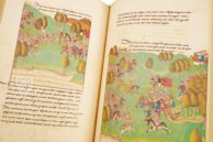 An unknown illuminator completed the 199 pen drawings in watercolors, in order to illustrate Schilling’s elegant gothic script. Sometimes fantastical illustrations are depicted from a bird’s eye view revealing citizens, cities, and villages in beautiful rolling landscapes. Such idealistic landscape paintings nevertheless are kept within the bounds of supporting Schilling’s bellicose text. The military campaigns, plunder, murder, and other violence were unsparingly embellished in the finest detail. Blood flows in rivers in the scenes, in which soldiers and knights lose their lives in battle. This early realism and apparent hero worship make the allure of the miniatures partly responsible for the fame of the work.