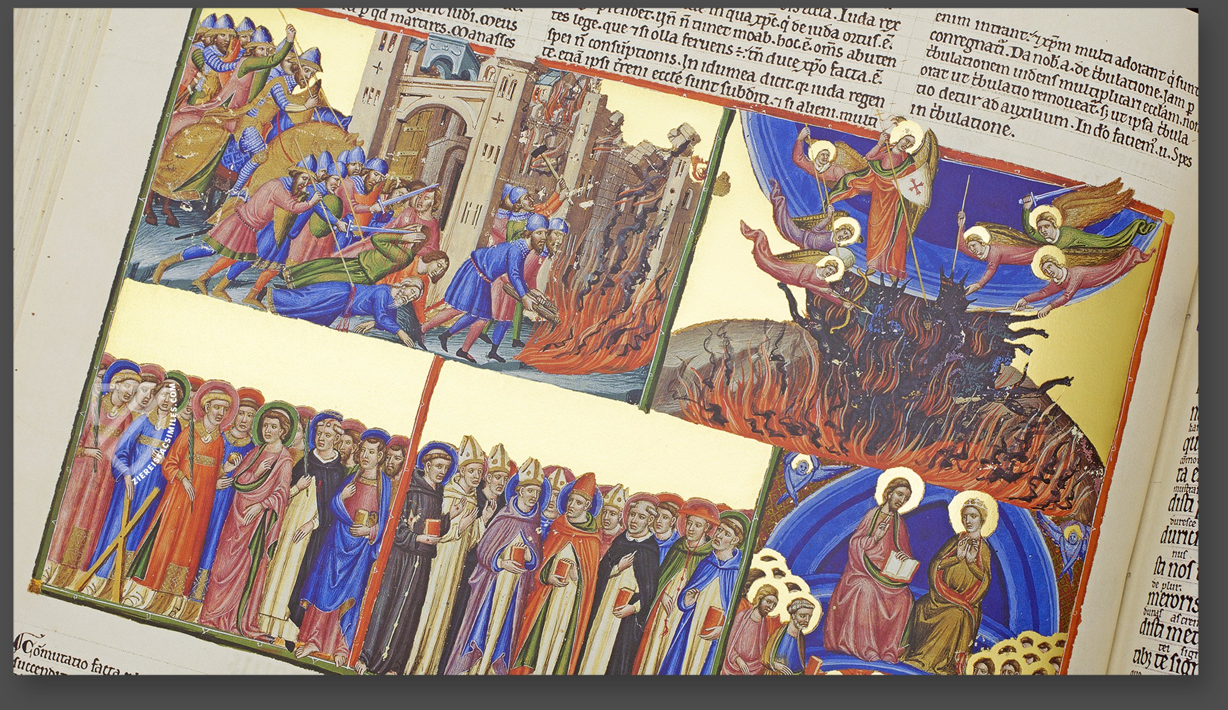 The miniatures of the psalter are shaped in a special manner after each Psalm. The pictures are always divided into several scenes and show a variety of high quality colors. Most are laid against a carmine red background and are adorned with filigreed and polished gold leaf. The second part of the manuscript was demonstrably illustrated by the studio of Ferrer and Arnau Bassas, two of the great Spanish book painters of the Middle Ages. The stylistic influences from various epochs and lands make the illuminated manuscript a unique work of art worldwide.