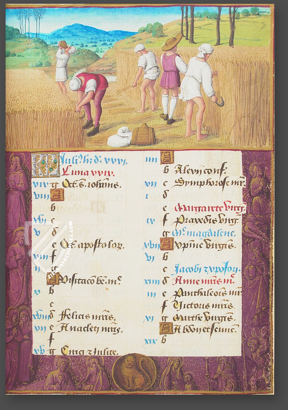 The Hours of King Henry VIII was designed by the master French illuminator Jean Poyer ca. 1500. It contains 55 breathtaking miniatures, which are reminiscent of large panel paintings in their quality. The work was probably gifted to the famous English king by Emperor Charles V and remained in the private possession of the English royal family for centuries. However, this is based on a tradition from the 18th century that has never been conclusively proven, but nonetheless, the codex is regarded as a highlight of French illumination and one of the finest handwritten codices ever made. The incredible miniatures show peasants working amidst idealized landscapes while detailed cityscapes and urban backgrounds paint a beautiful picture of life in a late medieval city. Contemporary garments from the simple clothes of a farmer working in the heat of summer to the sumptuous flowing robes of nobles to the arms and armor of soldiers are depicted with an equal level of detail and realism.