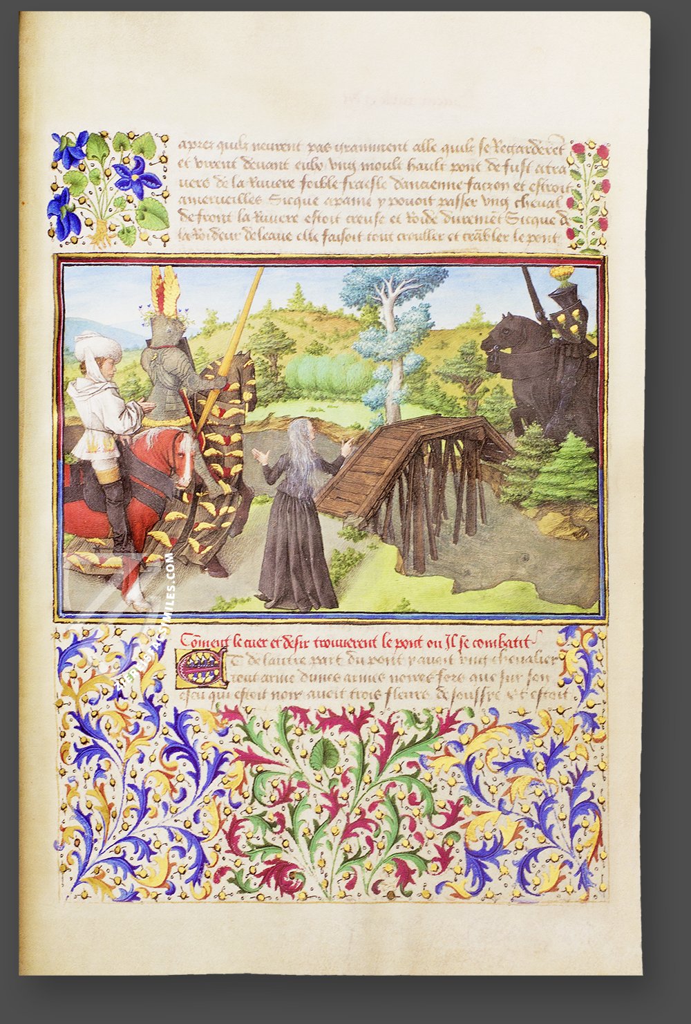 Barthélemy d'Eyck’s fantastic artistry is demonstrated in this miniature of the knight Cuer/Cœur (heart), his squire Désir (burning desire), and Melancholy, personified by a gray haired woman in a black dress, approach a bridge at Le pas Perilleux. It is guarded by the knight Soulcy, who is ominously dressed in black armor and mounted in a black horse, which is itself clad in black.
