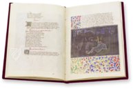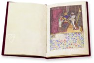 Barthélemy d'Eyck, originally Barthélemy van Eyck as he was of Dutch origin, was an incredibly talented painter and miniaturist who was primarily active in France and Burgundy during the mid–15th century. He was already recognized as the one of the greatest artists of his time by his contemporaries and is believed to have contributed to famous works like the Aix Annunciation and the Très Riches Heures du Duc de Berry, in addition to his work for Renè d’Anjou on several manuscripts including a book of hours, his tournament book Le Livre des tournois, and of course Le Livre du Cuer d'amours espris, the text at hand. He spent the better part of 30 years in the employ of Renè d’Anjou, perhaps even to the end of his life, and not only was his workshop located adjacent to his patron’s personal apartments, but he was also a personal attendant to Renè, a varlet de chamber. The close level of personal collaboration between them may account for the outstanding expressiveness of the miniatures and their harmony with the text. The scenes are incredibly atmospheric due to the masterful and detailed treatment of light: of 16 scenes, 4 are nocturnal and many of the others are scenes at dawn or dusk. His depiction of the play of light is incredibly detailed, showing how individual objects cast a shadow or glimmer in the light. Another 29 miniatures were planned in the manuscript, but they were completed by a younger, considerably less-talented hand. In the end, the Barthélemy’s miniatures captured the bitter-sweet nature of the text and can be regarded as the height of his artistry and a highlight of medieval illumination as a whole. The original codex is stored in Vienna’s Österreichische Nationalbibliothek under the shelf mark Ms. 2597, and is considered to be the oldest and most beautiful of the 6 Le Livre du Cuer d'amours espris manuscripts known to be in existence.