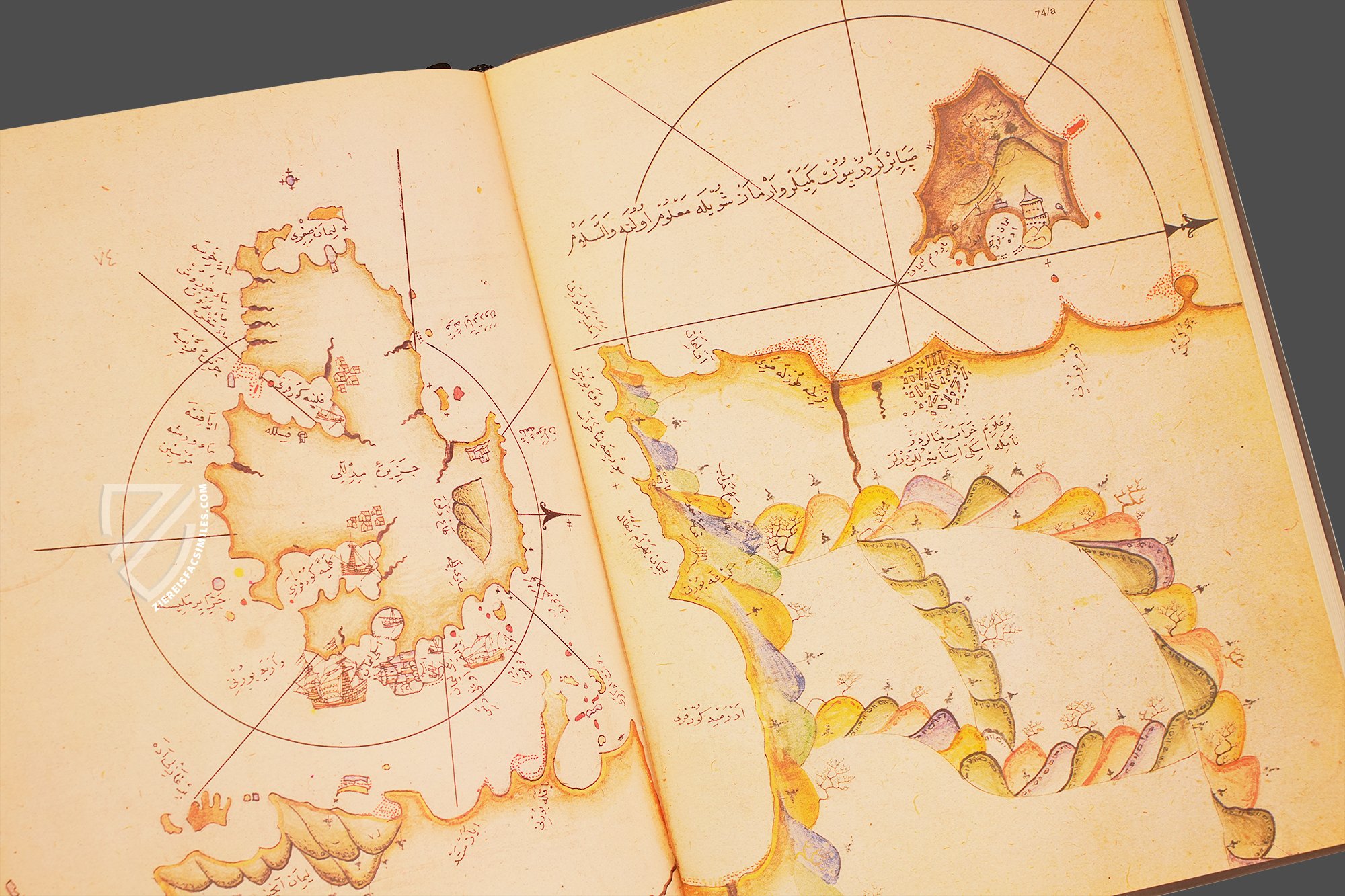 The Kitâb-ı Bahriye: Piri Reis' Book on Navigation is probably one of the most beautiful examples of Ottoman cartography. The ornate copy of the esteemed manual on seafaring in the Mediterranean, which is now kept in the Topkapı Sarayı in Istanbul, was produced in the second half of the 16th century and contains 215 multi-colored maps of the entire Mediterranean region. While the detailed coastlines shine in gold, the rivers stand out in black. Countless small illuminations of settlements and ships enliven the often almost minimalist-looking maps. The admiral of the Ottoman fleet and cartographer Piri Reis (ca. 1470-1554) originally dedicated his cartographic masterpiece, which he completed in 1521, to Sultan Süleyman I (ca. 1494/96-1566). Not long afterwards, the Grand Vizier Ibrahim Pasha (ca. 1493-1536) commissioned him to expand and revise the handbook. This version was the basis for the present manuscript.