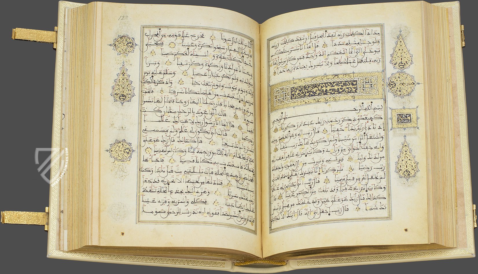 This gorgeous Koran from El Escorial originally came from Morocco, specifically from the mosque of the Al-Badi Palace. It originated at the behest of Sultan Ahmad Al-Mansur, who ruled as Sultan of Morocco from 1578–1603. The exact date for the formation of the manuscript is recorded in the text. It is recorded on page 264 that work on the Koran of Muley Zaidan was completed on the 13th of the month of Rabi II of the year 1008 according to the Hijri calendar year, so November 2nd, 1599.