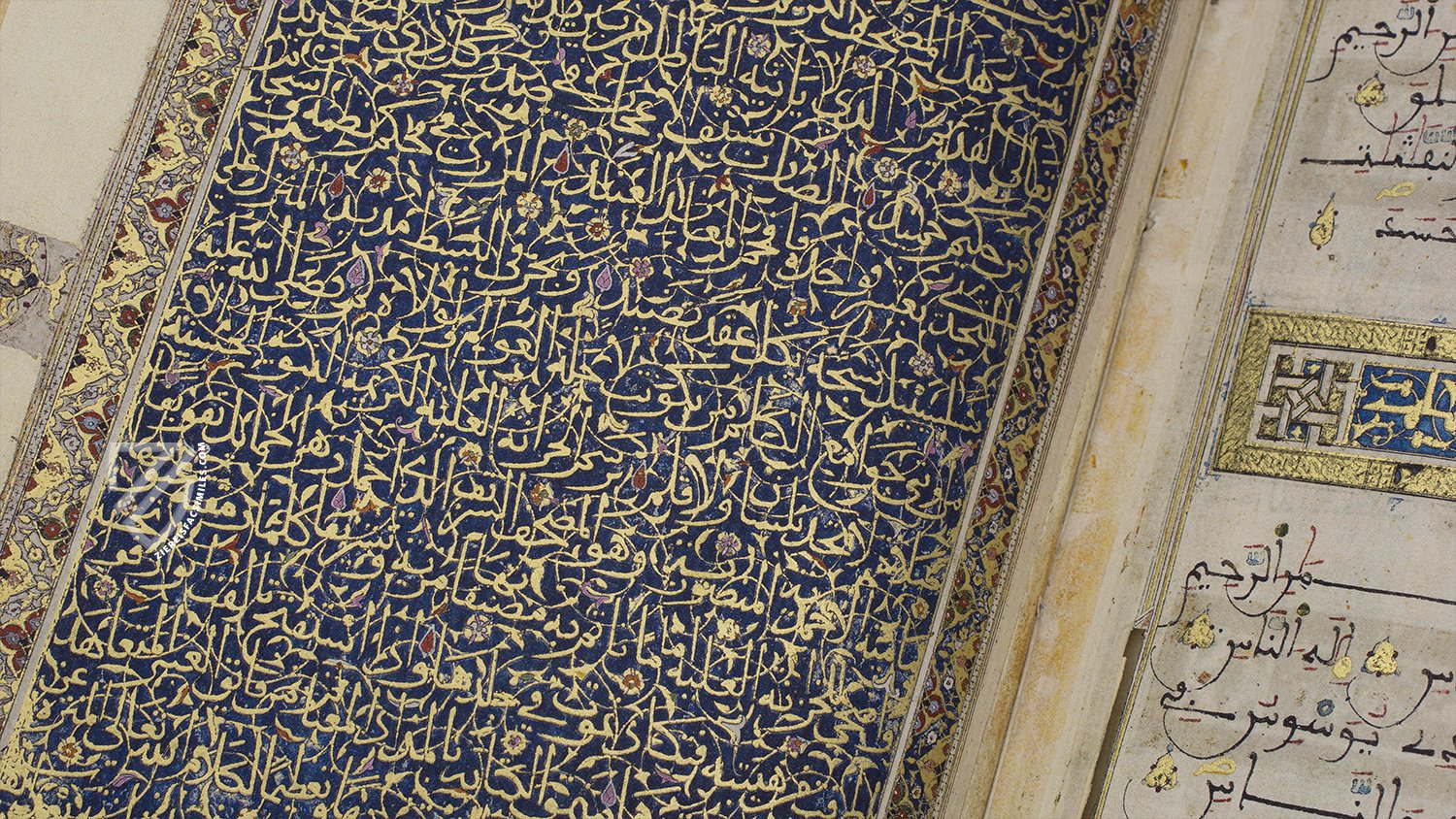 - Richly decorated throughout. Mabsut style, with vocalisation in red, tasdid and sukuns in blue. The especially handsome titles of the suras are written in gold Kufic on a blue ground. Folios 1v, 2r, 264v and 265v are splendidly illuminated with Moorish motifs