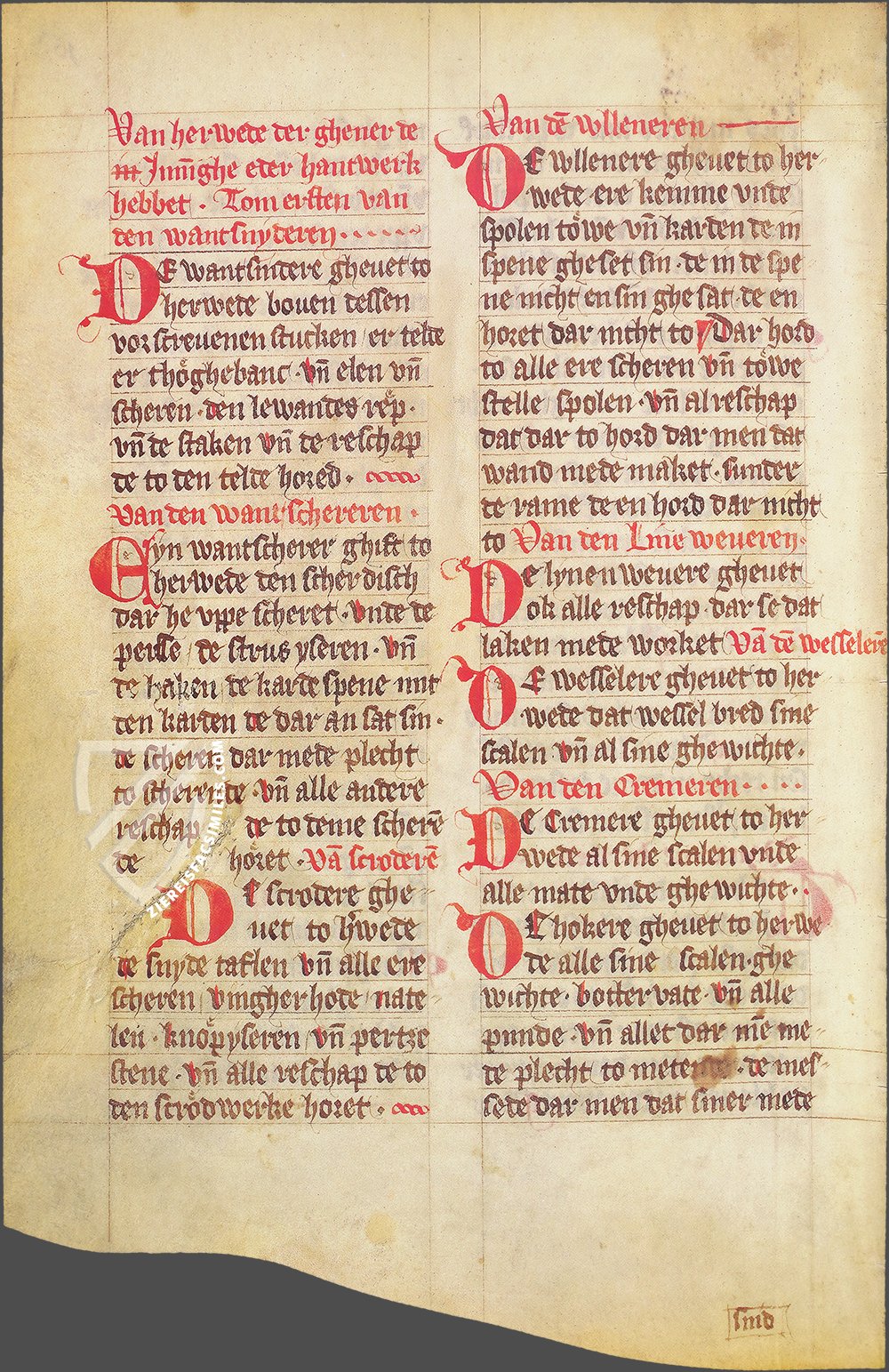 Surrounded by jurors debating the verdict of a trial, a court clerk records the proceedings while seated in front of the table, on which lies the court sword, a symbol of the authority to punish capitol offenses, and a reliquary, upon which oaths were sworn. The scribe wears a simple tunic and tights in comparison to the richly dressed burghers who are serving as jurors. He is believed to be the author of this manuscript – the initials “S” and “H” on his tunic identify him as Siffridus Hanteloye.