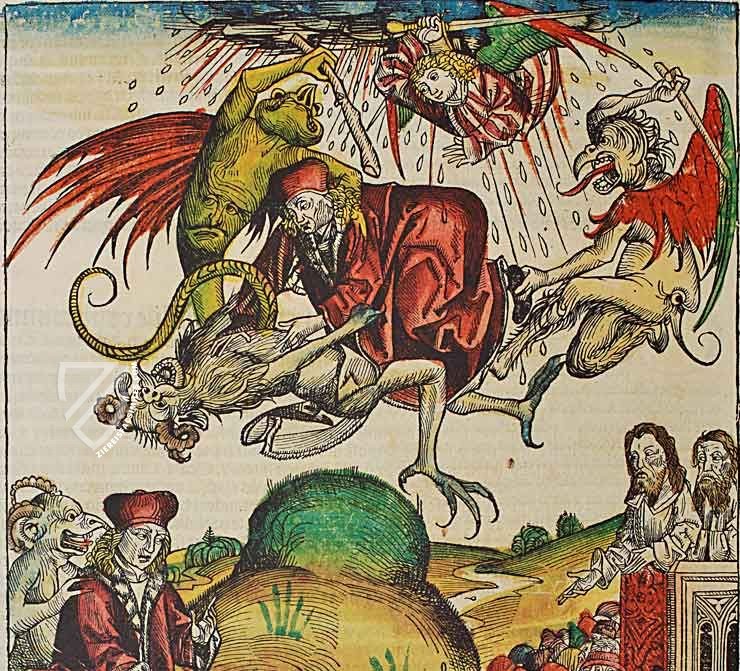 The ambitious book project was transcribed in the famous printing shop of Anton Koberger (ca. 1400/45–1513). 100 typesetters and printers at 18 presses busied themselves with work on the world chronicle for fifteen months. On 568 pages, the work collects over 1,800 woodcuts, an unprecedented abundance of images. The responsibility for this artistic design rested with the exceptional artist Michael Wolgemut (1434–1519) together with Wilhelm Pleydenwurff (ca. 1420–72) and his workshop. This is even where the most famous Nuremberg artist of this time, Albrecht Dürer (1471–1528) did his apprenticeship until the year 1490. Whether he too participated in the book project is fiercely debated among researchers.