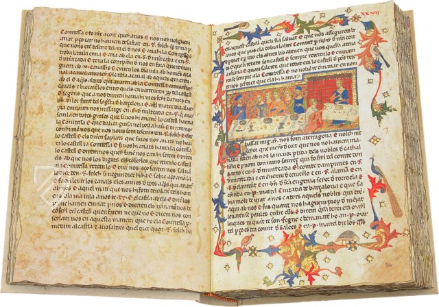 A truly unique historical manuscript originated from the Royal Abbey of Santa Maria de Poblet near Valencia. It is the so-called Book of Facts. The astounding manuscript can be regarded as the first autobiography of a medieval king worldwide. The events reflected in the work were entirely told from the first person perspective of King Jaime I of Valencia, all things considered it has been proven that the King himself was not the author of this life story. The biography was produced by gifted monks of the Spanish Poblet Abbey and is furnished with fantastic miniatures, playful historiated initials, and plant tendrils with animals in rich colors with gold adornment.