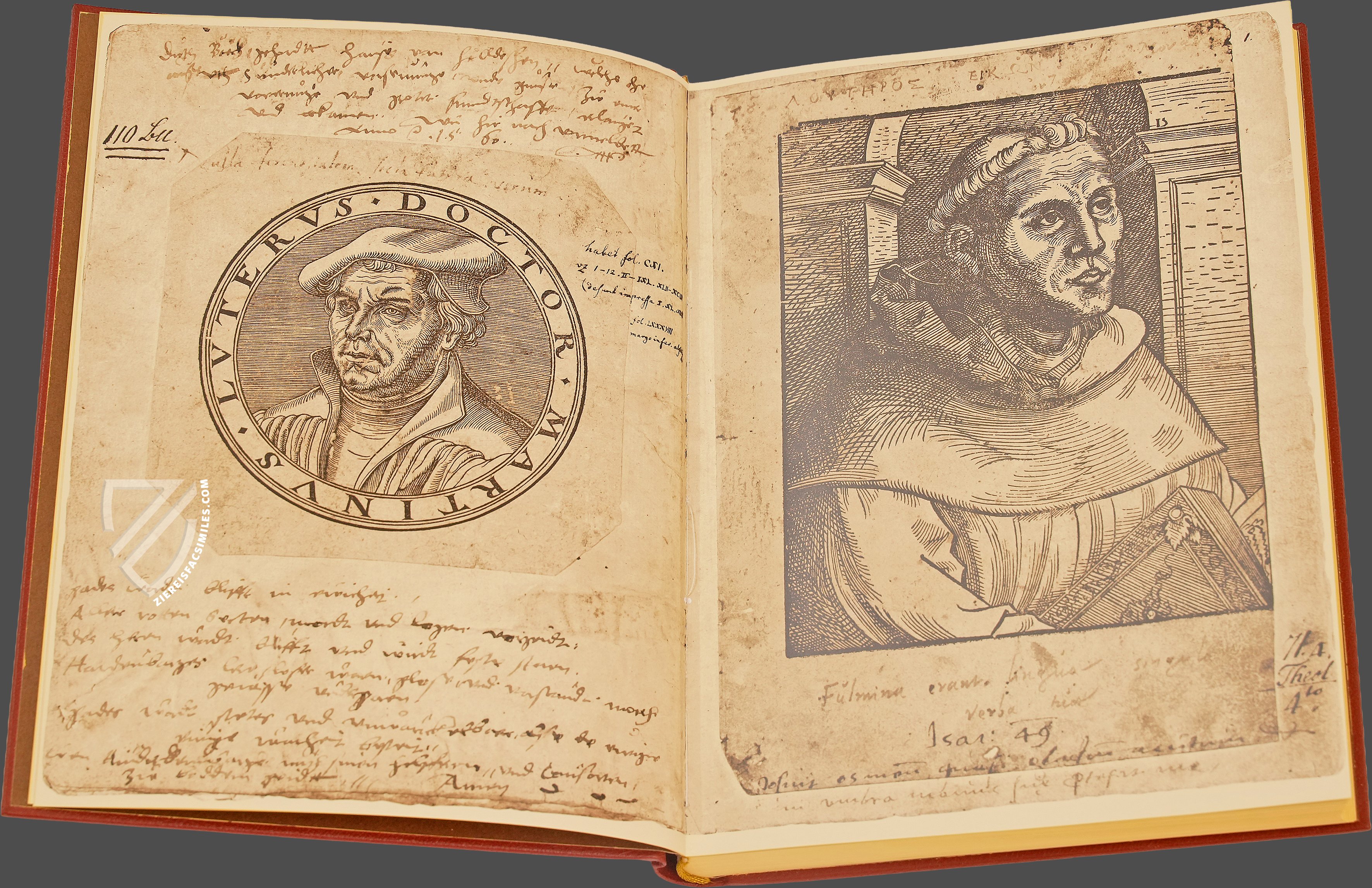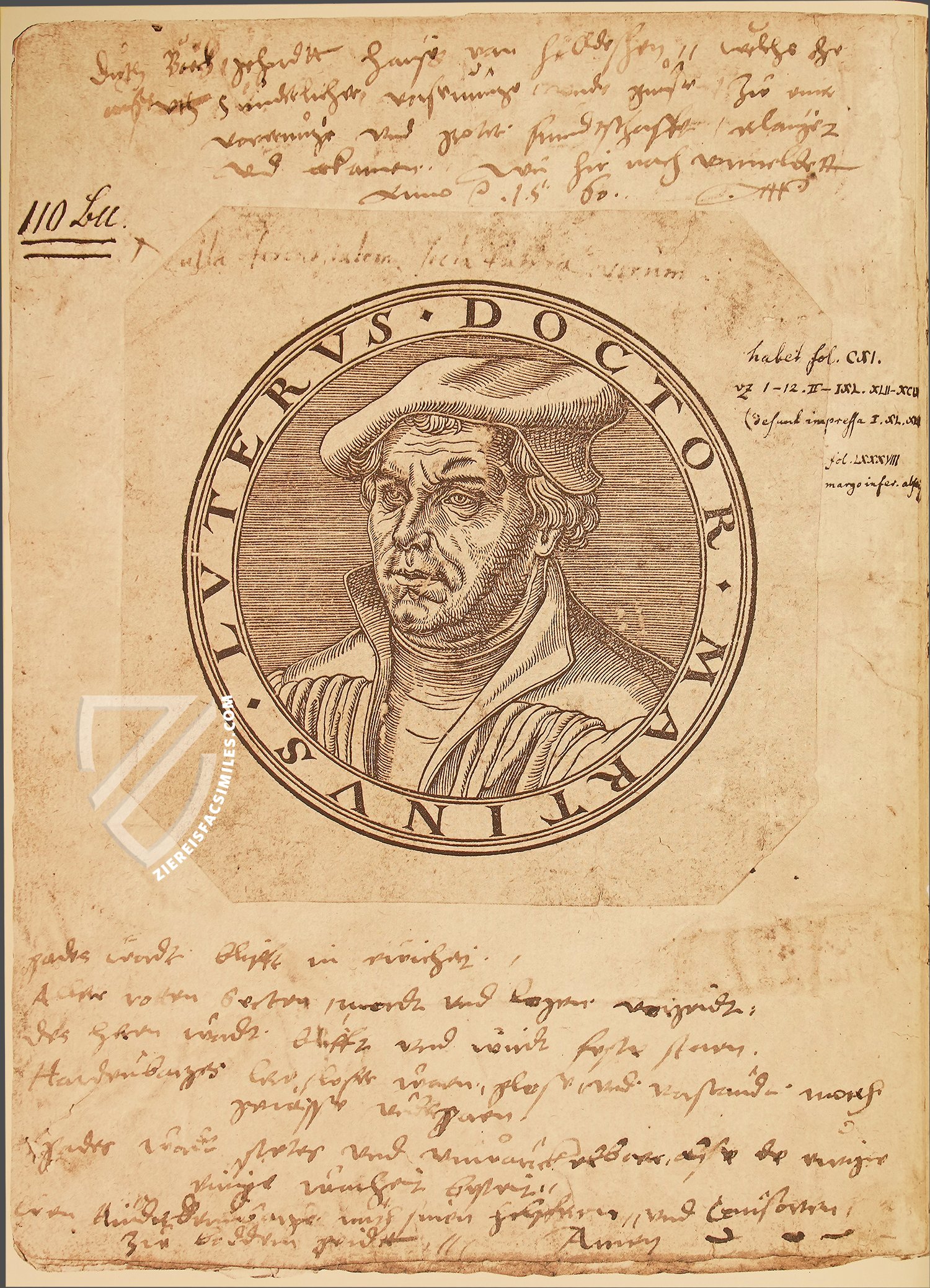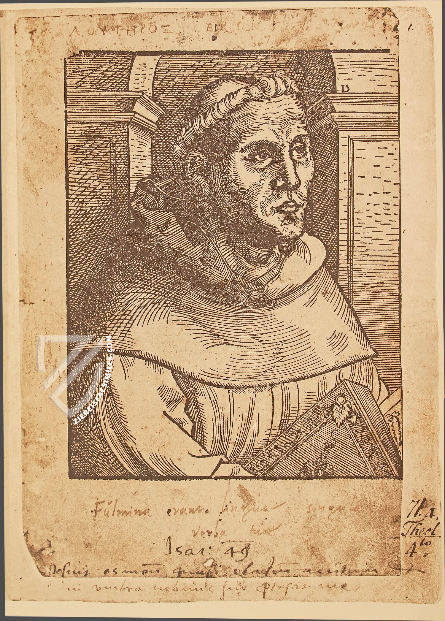 - 6 portraits subsequently pasted in: copperplate engraving of a medallion portrait of Luther, copperplate engraving of Melanchthon, woodcut of Luther as a monk and a pen-and-ink drawing of this portrait, colored bust portrait of a theologian, probably Tilemannus Heshusius