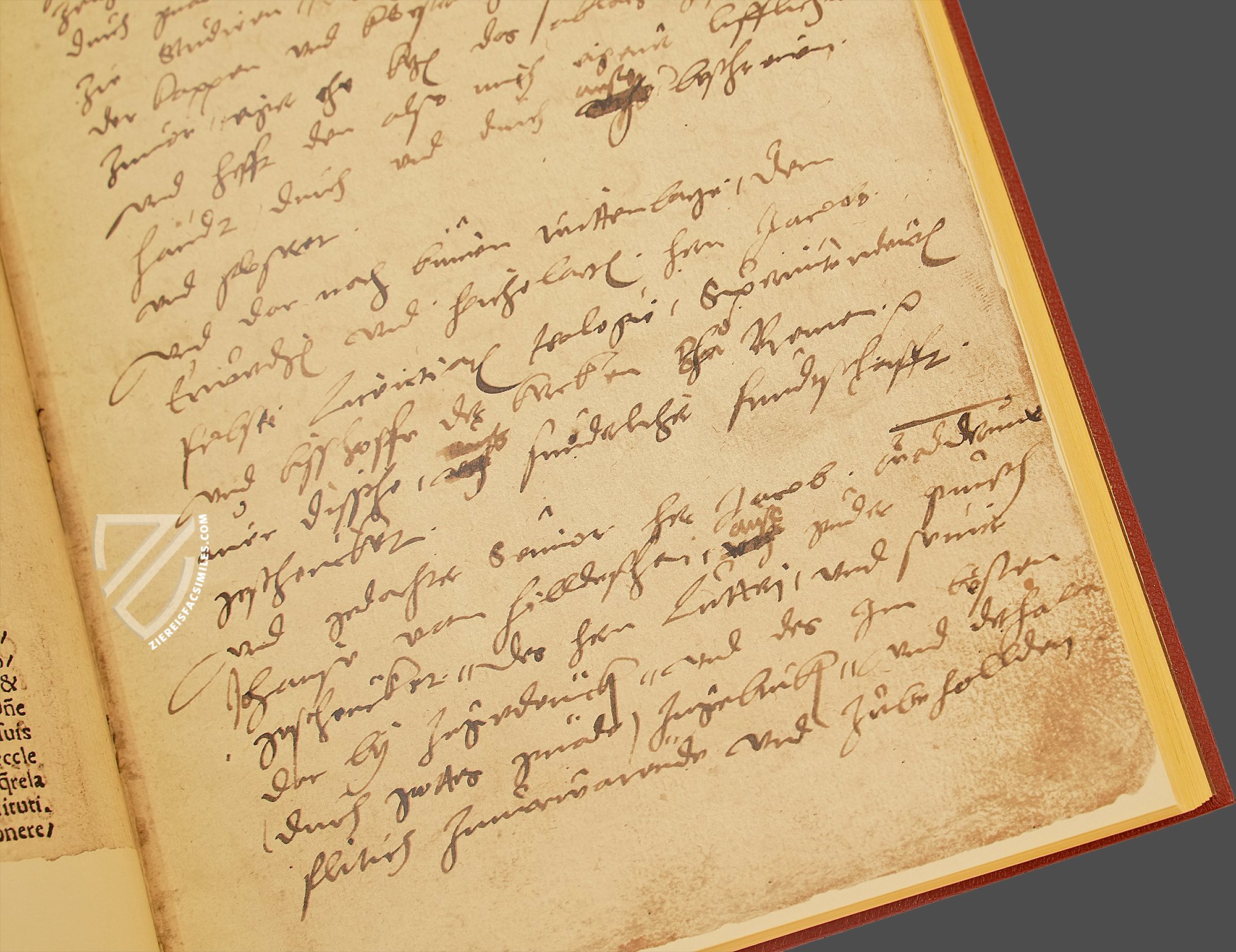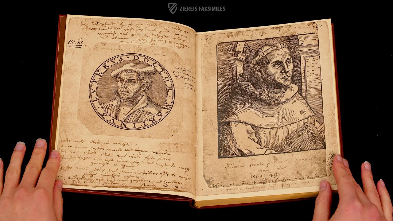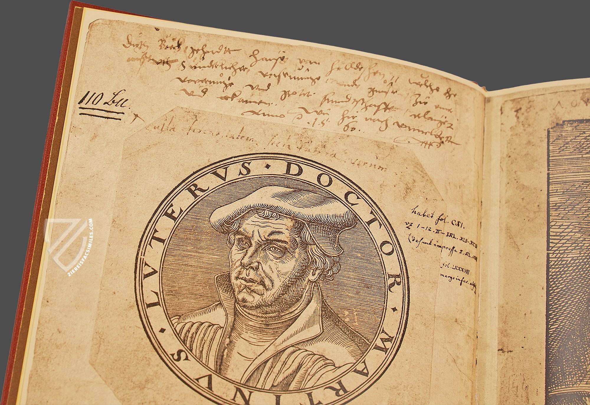 - 6 portraits subsequently pasted in: copperplate engraving of a medallion portrait of Luther, copperplate engraving of Melanchthon, woodcut of Luther as a monk and a pen-and-ink drawing of this portrait, colored bust portrait of a theologian, probably Tilemannus Heshusius