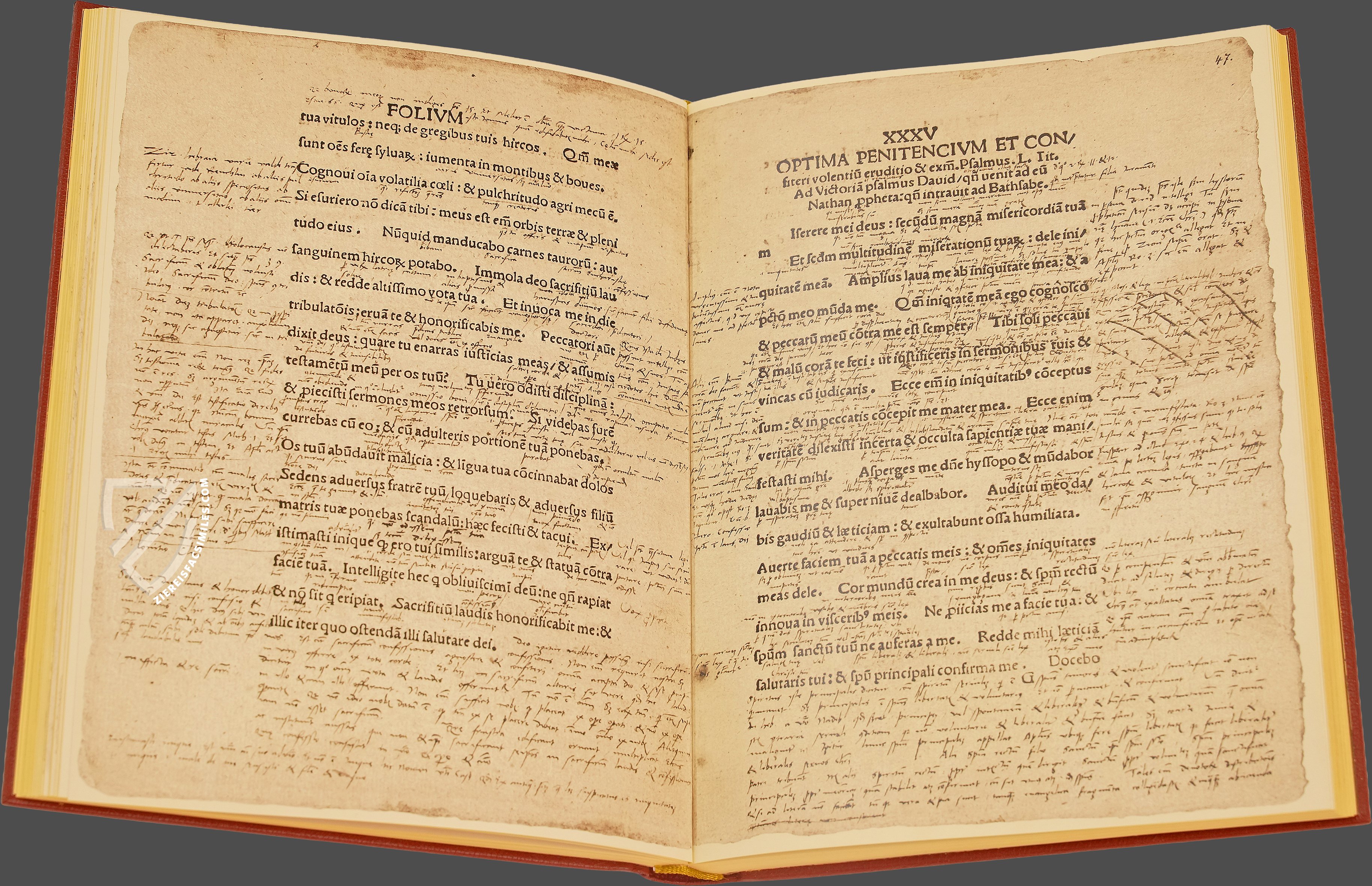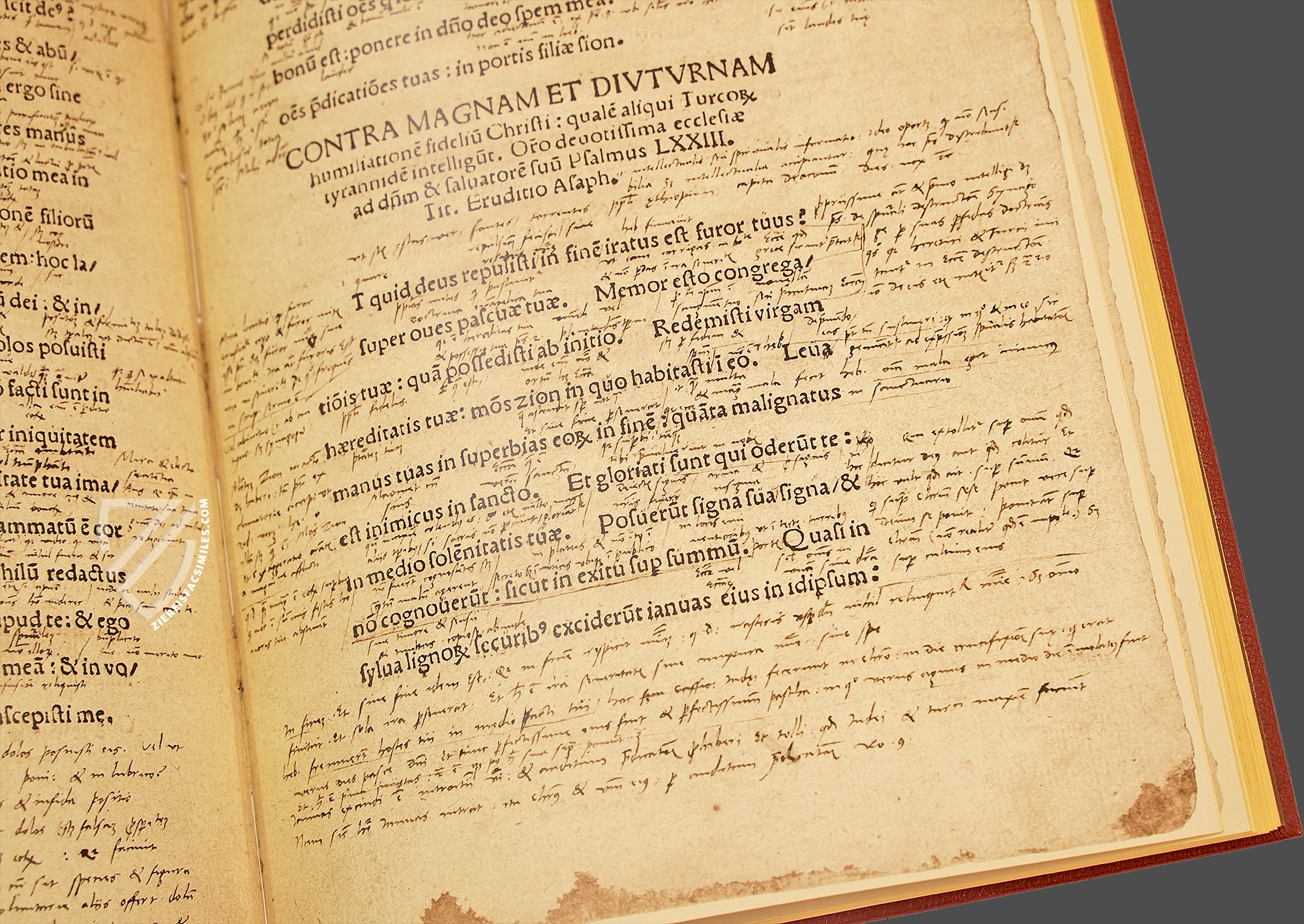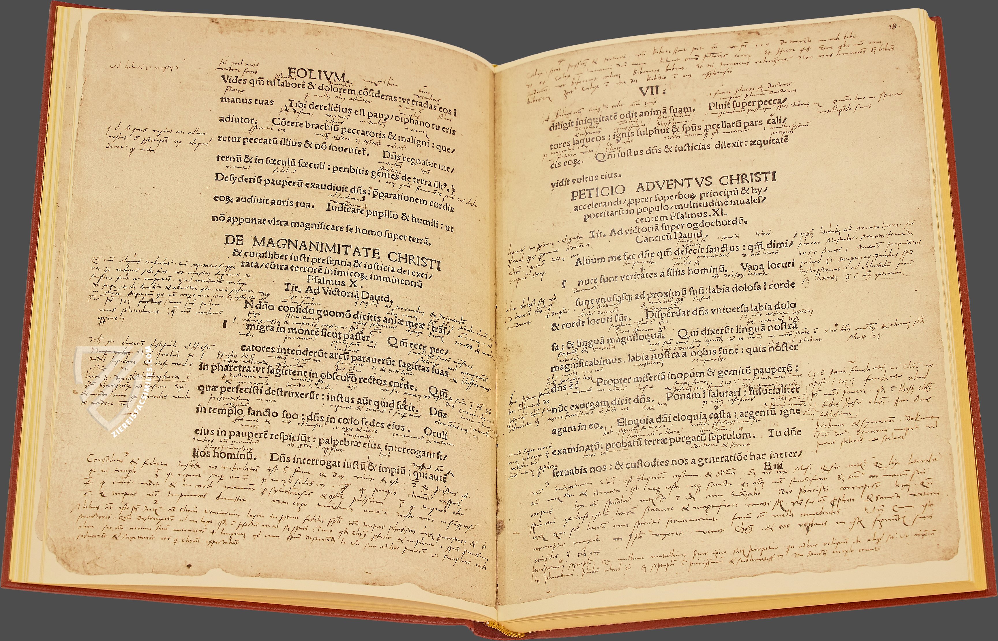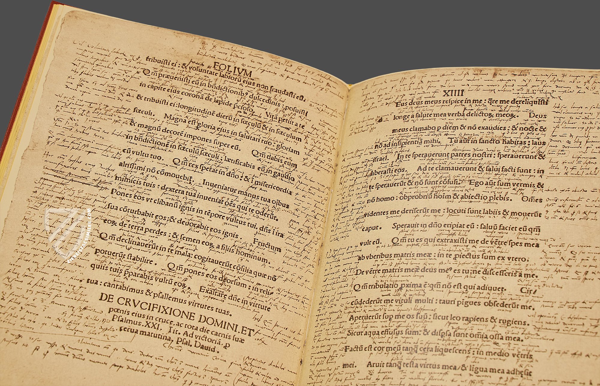 The so-called Luther Psalter is not only the earliest printed Luther text ever, but also the foundation of his first psalm lecture, which Martin Luther (1483–1546) gave at the University of Wittenberg from 1513 to 1515. In keeping with humanist tradition, he had a Latin psalter printed for the visitors to this lecture on June 8, 1513, in Johann Rhau-Grunenberg's workshop in Wittenberg. The working text was provided with particularly large line spacing and short summaries of the individual psalms. It is also noteworthy that Luther unusually has Jesus Christ appear as a speaker in the preface, presenting quotations from the Old and New Testaments in direct speech. Luther supplemented his own copy, which is now kept in the Herzog August Library, with countless glosses, some of which are more extensive than the psalm text itself. They are an invaluable testimony to the theology, biblical interpretation, and teaching activities of the important German reformer.