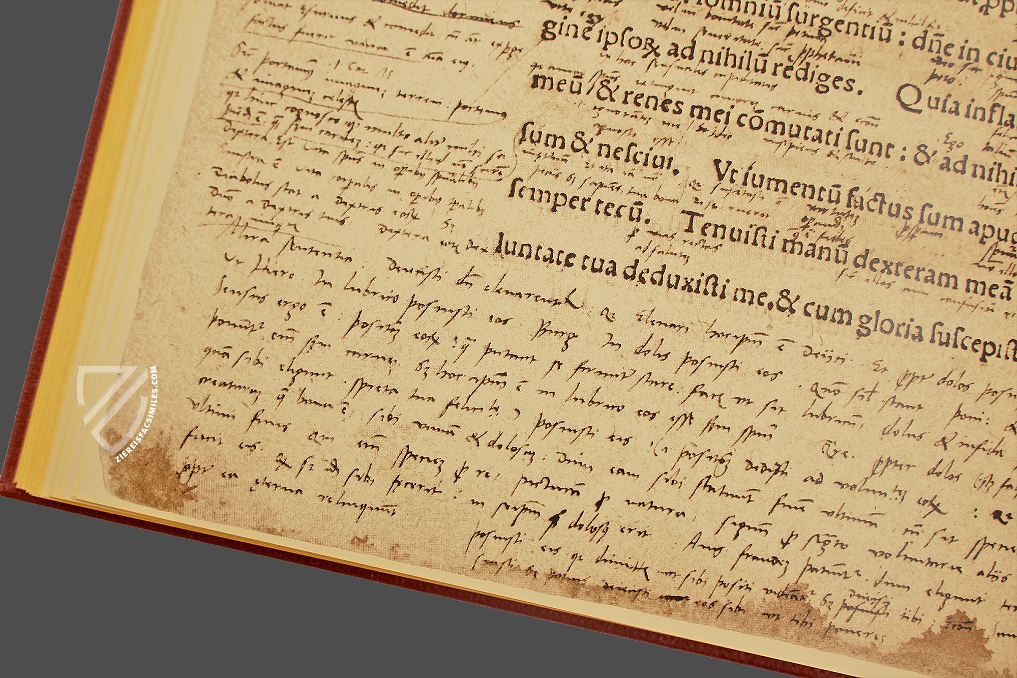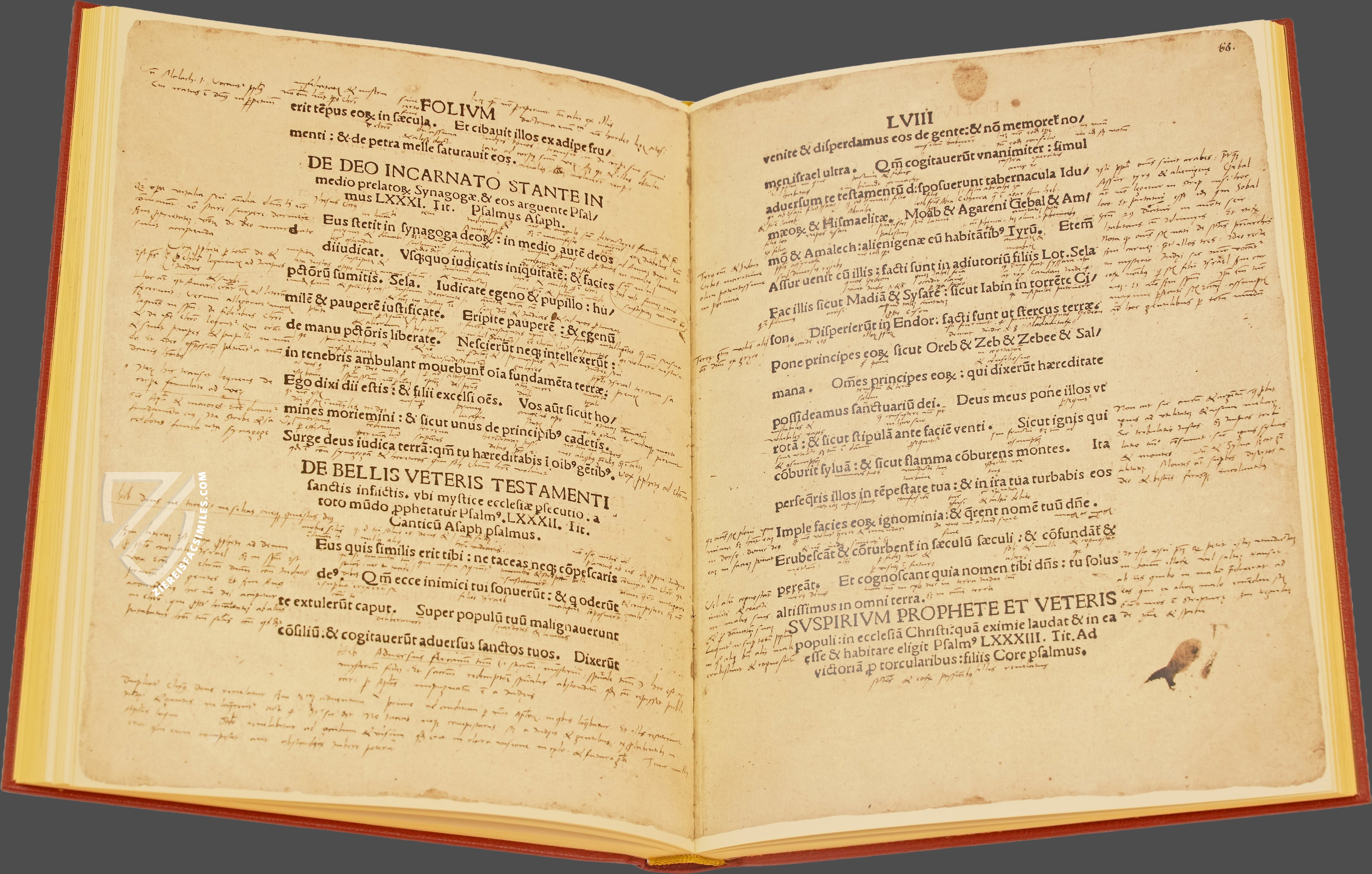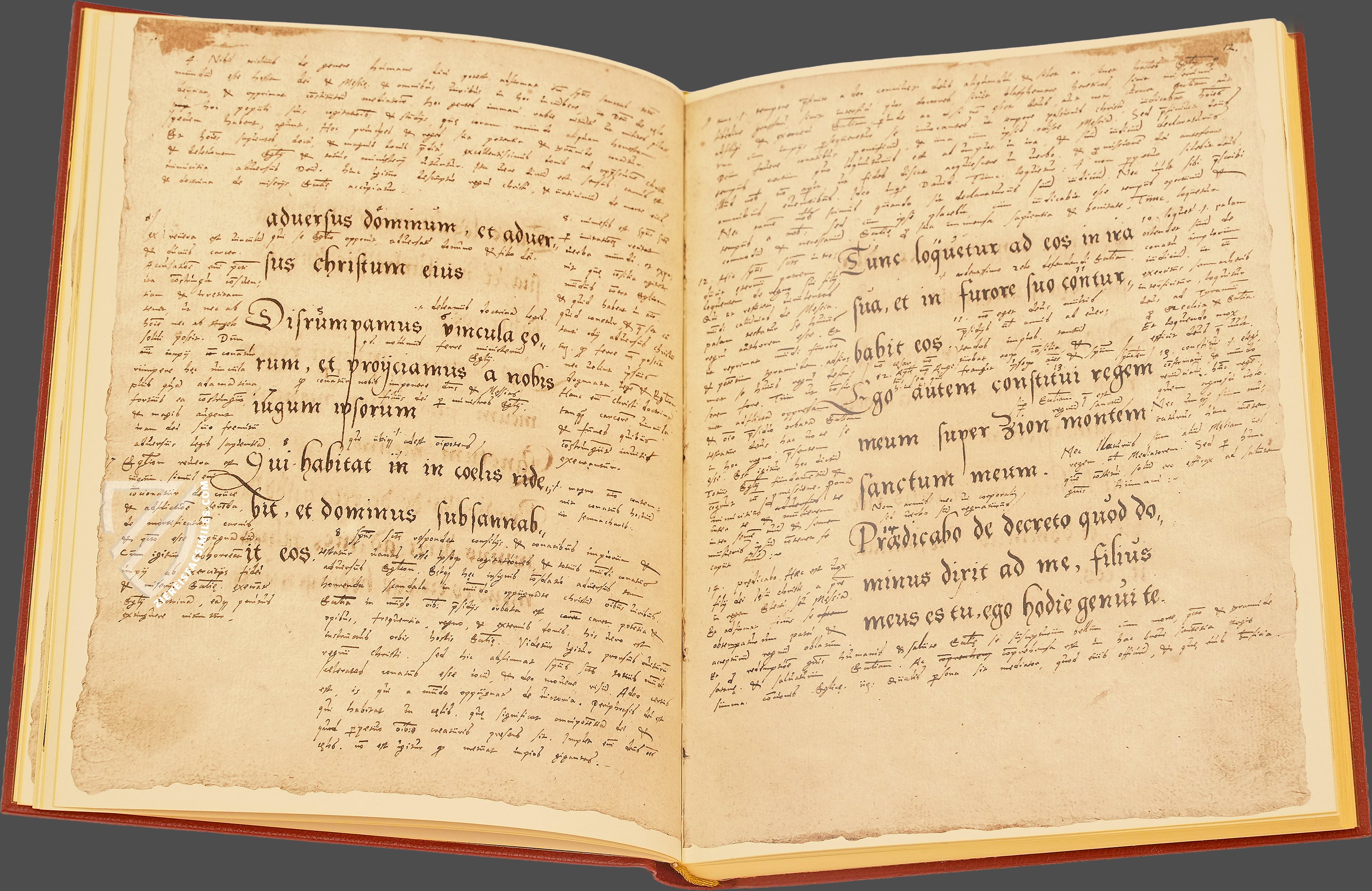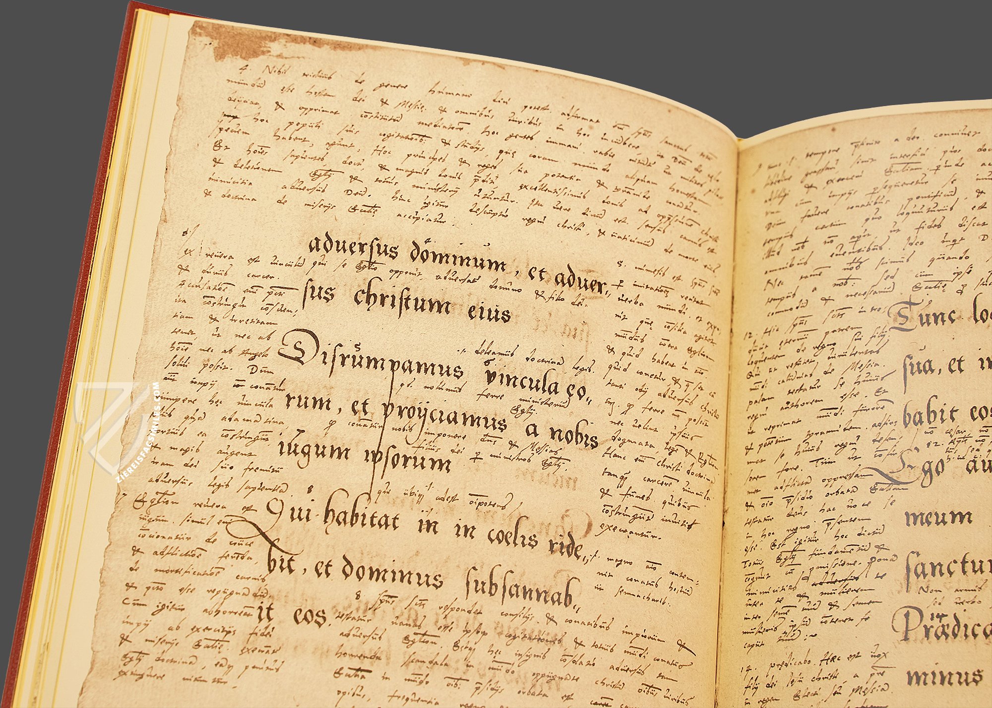 The so-called Luther Psalter is not only the earliest printed Luther text ever, but also the foundation of his first psalm lecture, which Martin Luther (1483–1546) gave at the University of Wittenberg from 1513 to 1515. In keeping with humanist tradition, he had a Latin psalter printed for the visitors to this lecture on June 8, 1513, in Johann Rhau-Grunenberg's workshop in Wittenberg. The working text was provided with particularly large line spacing and short summaries of the individual psalms. It is also noteworthy that Luther unusually has Jesus Christ appear as a speaker in the preface, presenting quotations from the Old and New Testaments in direct speech. Luther supplemented his own copy, which is now kept in the Herzog August Library, with countless glosses, some of which are more extensive than the psalm text itself. They are an invaluable testimony to the theology, biblical interpretation, and teaching activities of the important German reformer.
