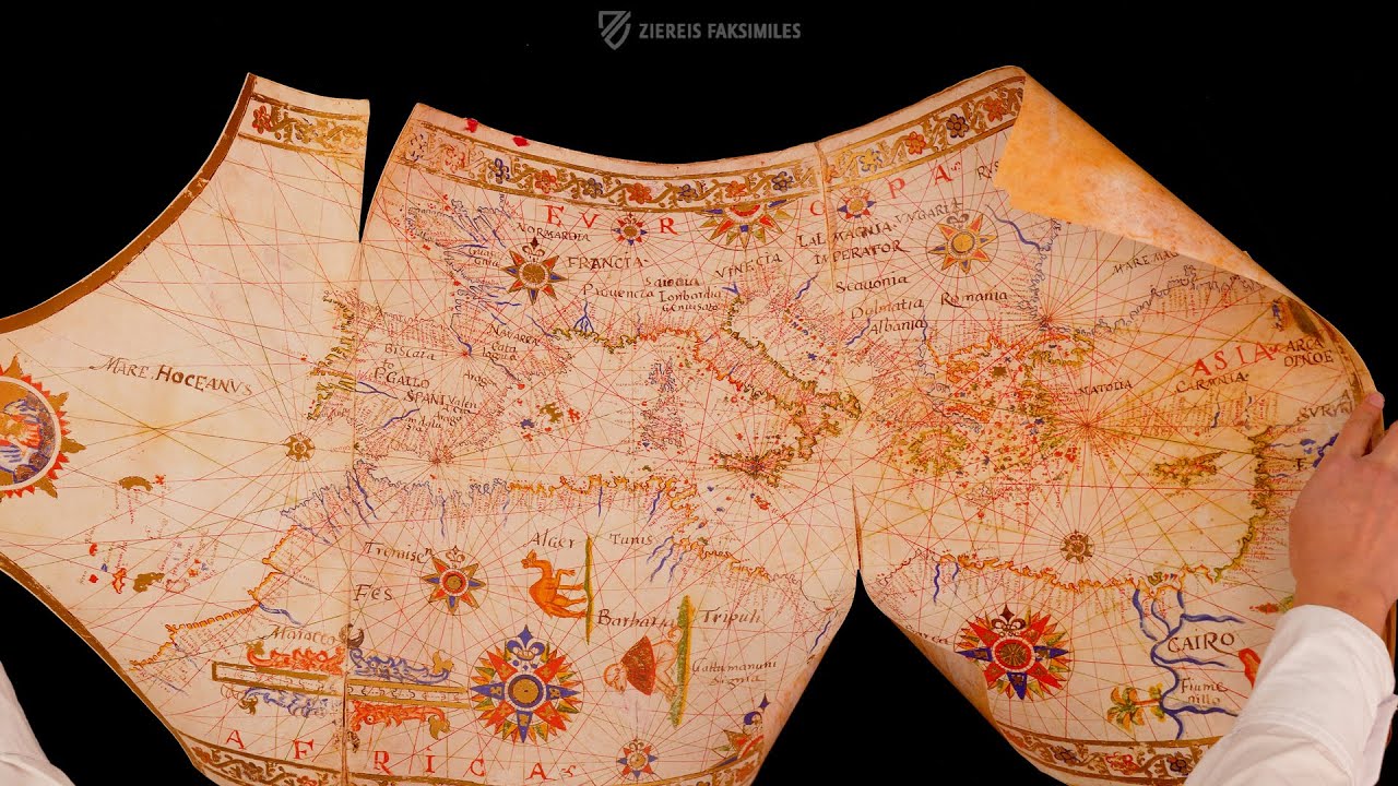 This magnificent map is composed of three pieces of parchment, the rightmost of which shows the eastern Mediterranean and the regions bordering it to the north and south around the Red Sea (“Mare Russa”) and the Black Sea (“Mare Magiori Seu Nigro”) – from Russia and Tartaria to Cairo. Several geographical and historical landmarks are highlighted in these regions.