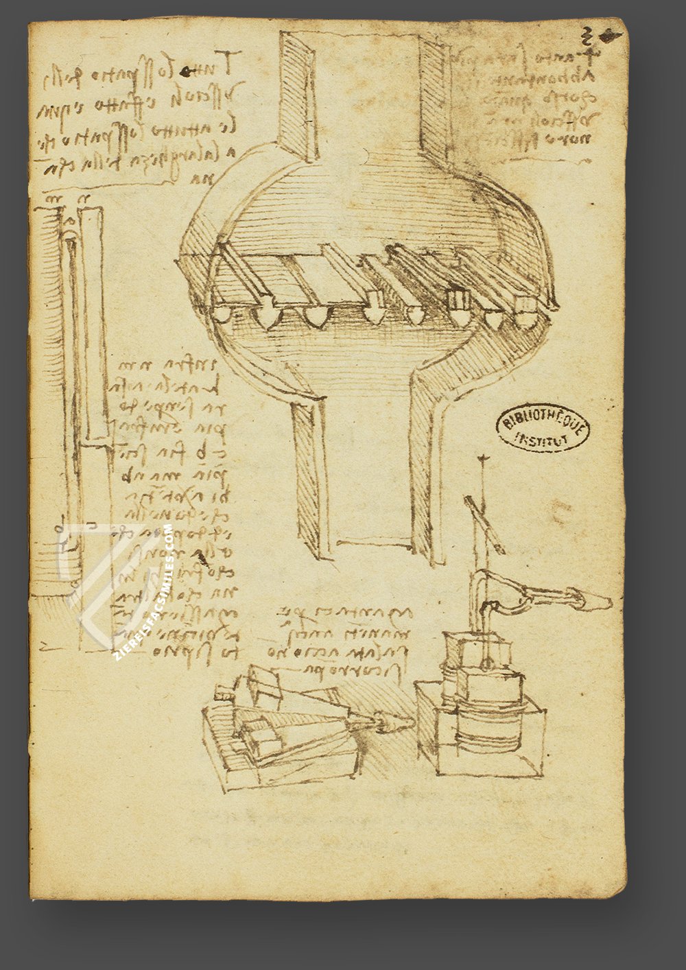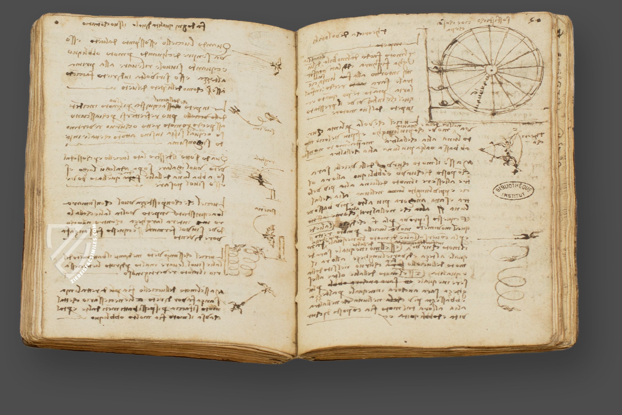 Leonardo recorded his thoughts and ideas for posterity in numerous notebooks along with fleeting and spontaneous ideas, personal notes, but also a full-length treatise. A compendium of twelve of these books is stored today in the collection of the Institut de France in Paris. These notebooks originate from the years 1492β1516 and present themselves in their entirety and in their original condition as a unique artifact for the study of the life and works of the Renaissanceβs excellent universal genius: Leonardo da Vinci. Under Napoleon, it came to Paris in 1795 from the Biblioteca Ambrosiana in Milan.