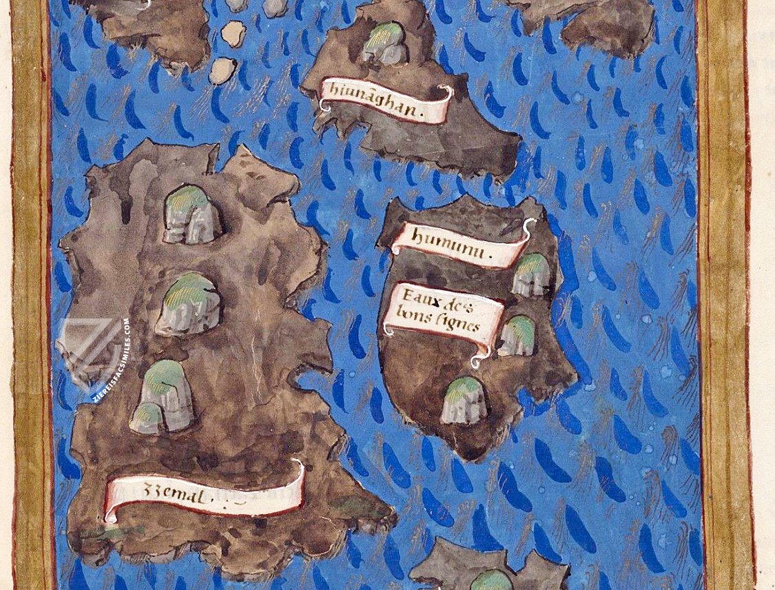 Amerigo Vespucci (1454–1512), famous for lending his name to the Americas, was appointed Spain’s first piloto mayor de India or pilot major in 1508. After his death, Juan Vespucci (ca. 1460 – ca. 1524), who was either Amerigo’s brother or nephew, took his place. He created “The Royal Register”, an official map of Spain’s colonial empire. It is likely the largest and most elaborately colored Spanish map in existence, and displays Portuguese artistic influences. It is presented here together with the personal journal of Antonio Pigafetta (ca. 1491 – ca. 1531), a companion of Ferdinand Magellan (1480–1521) during his famous circumnavigation of the globe. He was one of only 18 men to return to Spain out of the ca. 240 who set out three years earlier. His journal is the primary source of material for information about the famous voyage. He was one of three men who were presented to the King to give an account of the harrowing expedition as described in his diary. Illustrations of several islands and coastlines accompany the text. His estimations of distances and routes were surprisingly accurate and valuable to cartographers. The narrative includes details of the terrible suffering of the crew during times at sea when supplies ran low and the men were dying of starvation and disease. For his valiant efforts, Pigafetta was named a Knight of Rhodes.