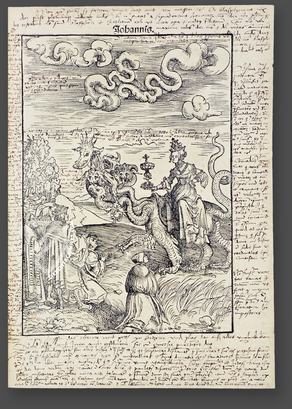 An angel who shows John this image explains to him that this is Babylon, the Mother of Harlots, who is drunk on the blood of martyrs i.e. persecution of the faithful. The horns of the beast represent the kings ruling the Earth who give power to her until they rise up and overthrow her. Notes from the hand of Johann Gramann concerning the dense imagery of this woodcut fill the margins.