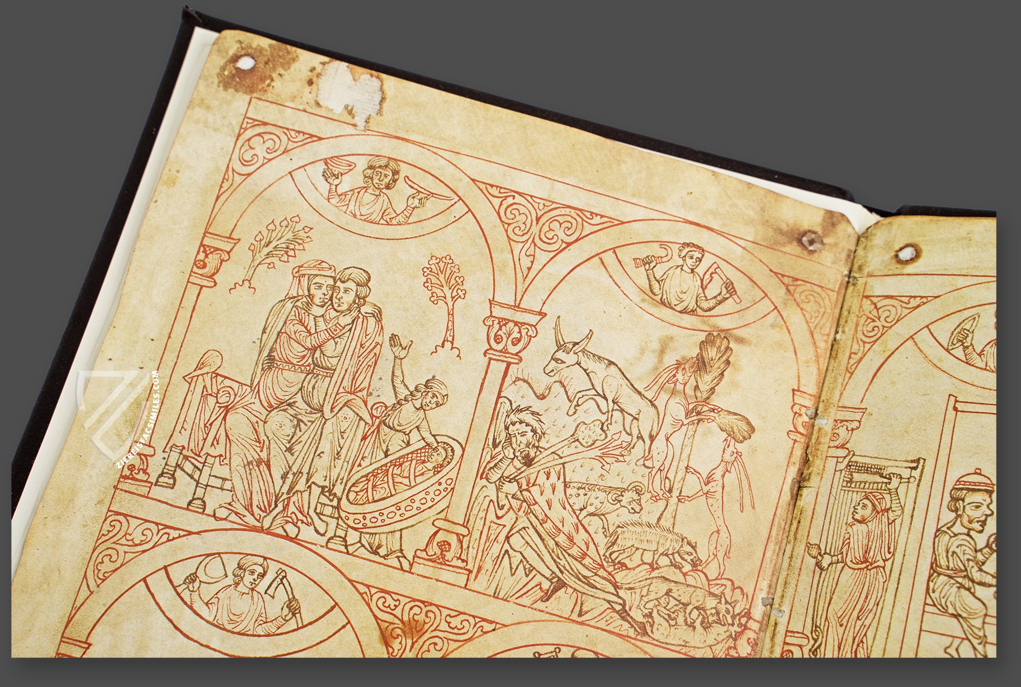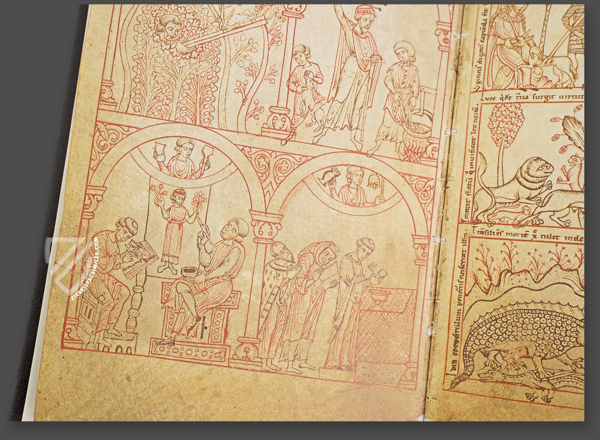 So-called "model books" served generations of medieval book artists as catalog-like models for their fascinating works, especially as illuminators, scribes, and their workshops increased in number throughout the Middle Ages. These books were filled with everything an artist would need to fill and were especially helpful for showing plants and animals that they might not otherwise have come into contact with. In addition, pattern books were used in training and for consultation with clients. The Model Book of Rein is the oldest and most beautiful of these model books to survive the Middle Ages and dates to the 13th century and as such, may very well have influenced generations of illuminators and scribes. It is named after its place of origin, the Cistercian monastery Rein near Graz. On 13 leaves, an unknown artist compiled scenes from daily life in concise genre paintings in the 13th century, supplemented by depictions of animals, several initial alphabets, and patterns for floor tiles and stained-glass windows. Crafts, hunting and fishing as well as various occupations in a monastery not only bring medieval everyday life to life today, but also bear important witness to the self-perception of an entire stylistic epoch.