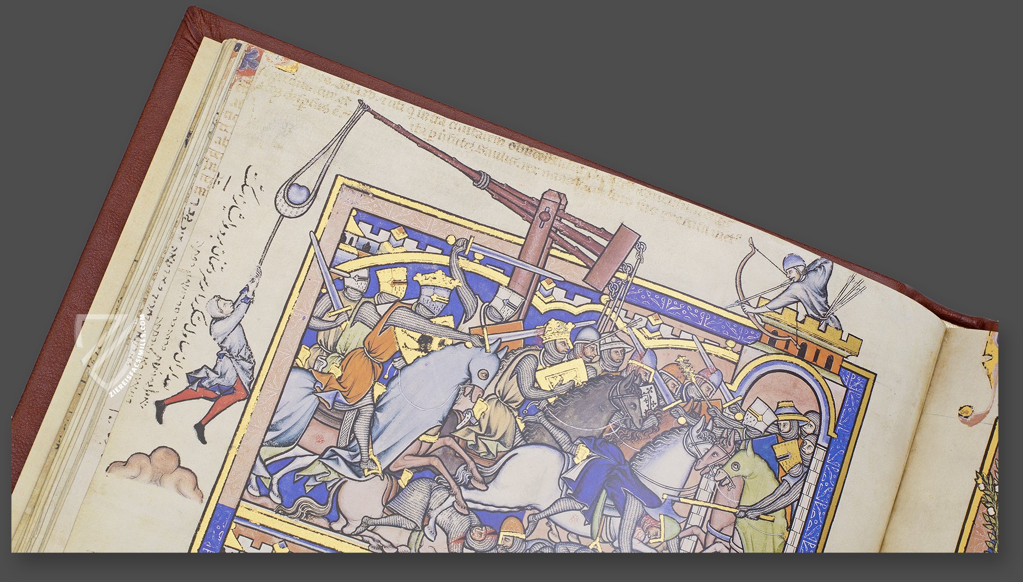 The Morgan Crusader Bible is probably the most extraordinary work from the book collection of King Louis IX. It is a pure picture book illustrating the events of the Old Testament in 283 high-quality miniatures. This codex is famous the world over and has had several important owners who had explanatory commentaries append the pictures in Latin, Persian, Arabic, Judeo-Persian, and Hebrew. Its miniatures resemble the stained glass and mural paintings of the Sainte-Chapelle in Paris, which was also commissioned by Louis IX, and dress the events in the clothing, armor, and weapons of the 13th century, making it a valuable source about contemporary life and warfare. The artfulness and masterful execution of the miniatures often contrasts with the brutal, gruesomely detailed scenes of medieval combat that they depict.