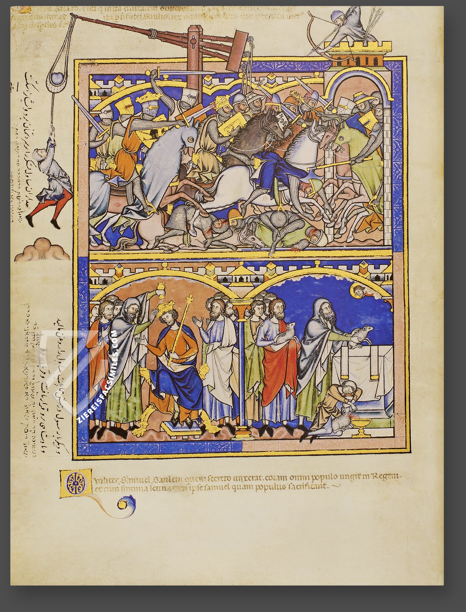 This is a gruesome masterpiece of the Gothic style and possibly the most famous image of medieval illumination. In 1 Samuel, an army of Ammonites under the command of King Nahash is besieging the Israelite city of Jabesh-Gilead. This scene depicts the moment when a relieving army commanded by Saul crashes into the rear of the Ammonites.