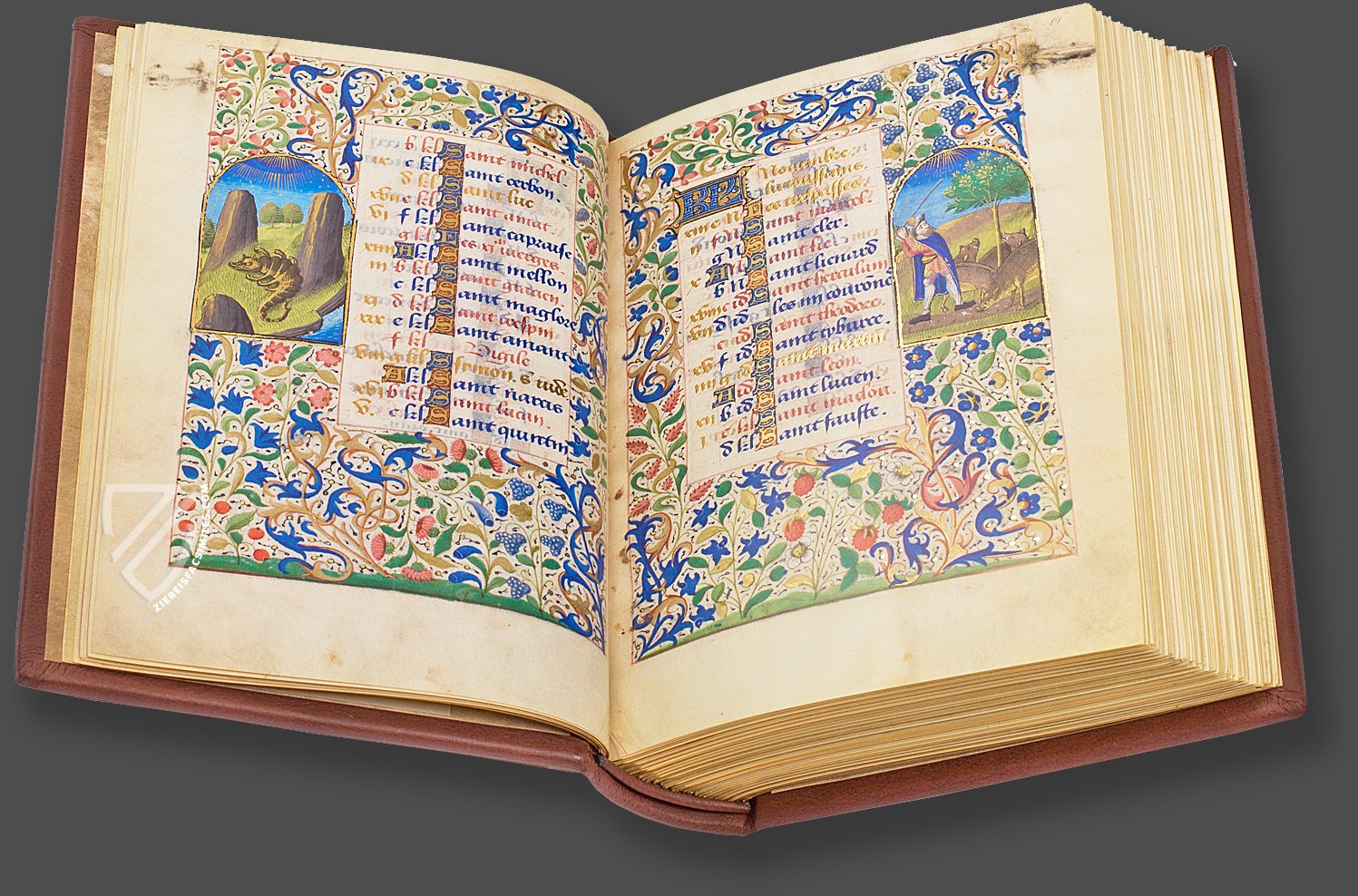 The Moscow Book of Hours is an imposing parchment manuscript originating in Paris in the 1470s. With a total of 17 large-format miniatures and a 24-picture calendar cycle, it invites the beholder into a fantastical world of lovingly designed interior spaces and enchanting landscapes with georgeous castles and palaces. At the same time, both the artistic pictorial works and the opulent borders, magnificent decorated initials and the neatly written texts are embellished throughout with gold, which makes the manuscript an extremely precious testimony to late medieval private devotion. Two talented illuminators were probably involved in this luxurious masterpiece, who had close connections to Dutch and French artists such as Rogier van der Weyden and the Master of CoΓ«tivy. Who commissioned them to create the magnificent manuscript is still unclear today, as any identifying marks of the patron, such as the coat of arms, have been scraped off.