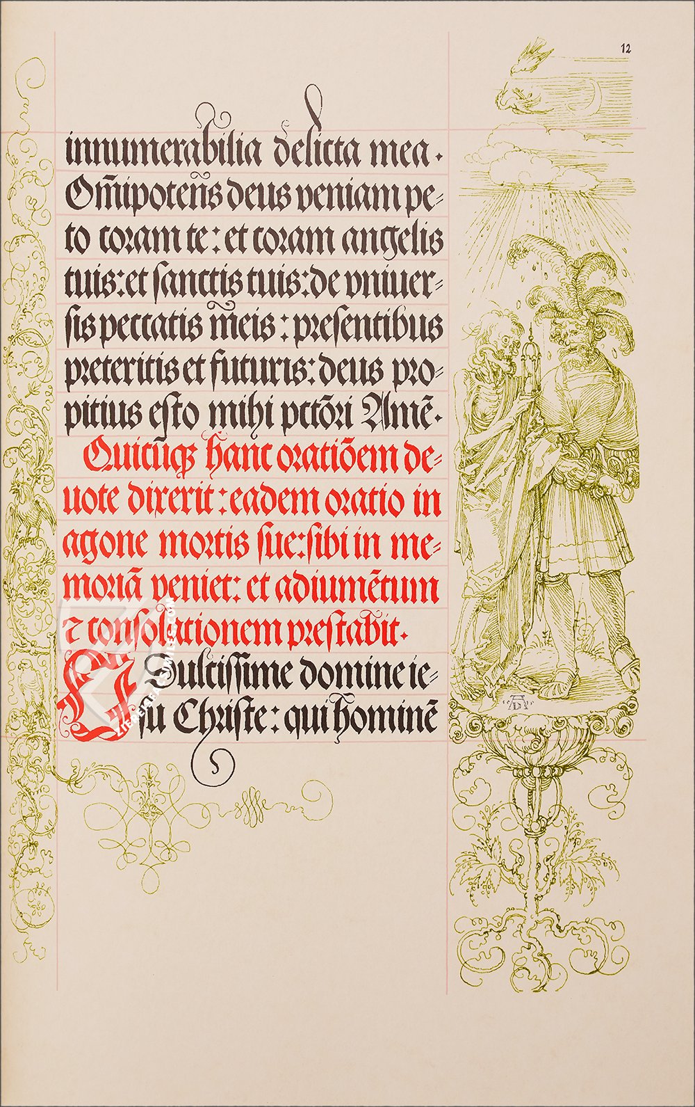 The Prayer Book of Emperor Maximilian I is a Latin text published in 1513 by the imperial court printer Johann Schönsperger the Elder (ca. 1455-1521) in Augsburg, Germany. It was a parchment edition of only ten copies intended either for the personal use of Emperor Maximilian I (1459-1518), members of the Order of St. George, or those close to the Emperor. It is famous for its ornate typography with an early version of Fraktur, but one copy was additionally adorned with marginal drawings by leading artists of the time ca. 1514-15. For whom this sample was intended is unknown today, but researchers generally believe that it was made for Maximilian I. The precious book was divided at an unknown time with one section going to Besançon and the other to Munich, where it arrived ca. 1598-1600. The Munich manuscript is famous for its incredible marginal drawings from two of the most important artists of the German Renaissance: Albrecht Dürer (1471-1528) and Lucas Cranach the Elder (1472-1553).