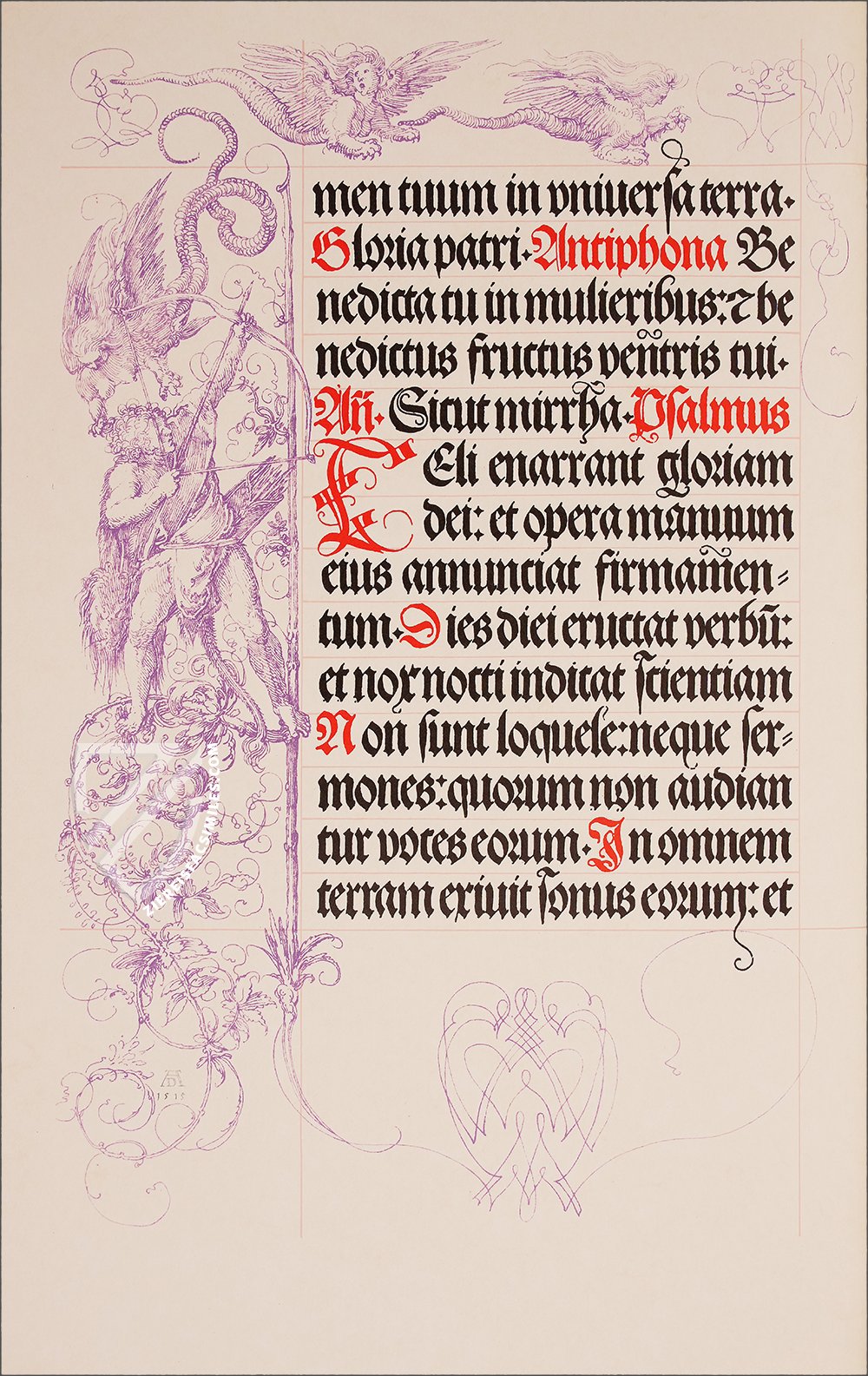 Published in a limited run of ten copies, this splendid prayer book was printed on parchment in 1513 for the use of Emperor Maximilian I and his close supporters. This select group was designed to look like manuscripts and feature hand painted initials adorning the printed text, which uses an early form of Fraktur. One of the copies, believed to have been owned by the Emperor himself, was furnished with marginal pen and ink drawings by some of the finest masters of the period. A fragment of this manuscript, which is found today in Munich, features extraordinarily detailed and artful drawings in the grisaille style by no less than the famous German Renaissance masters Albrecht Dürer and Lucas Cranach the Elder. Aside from gorgeous and terrifying biblical scenes, an incredible variety of secular motifs adorns the margins of this fascinating synthesis of the arts.