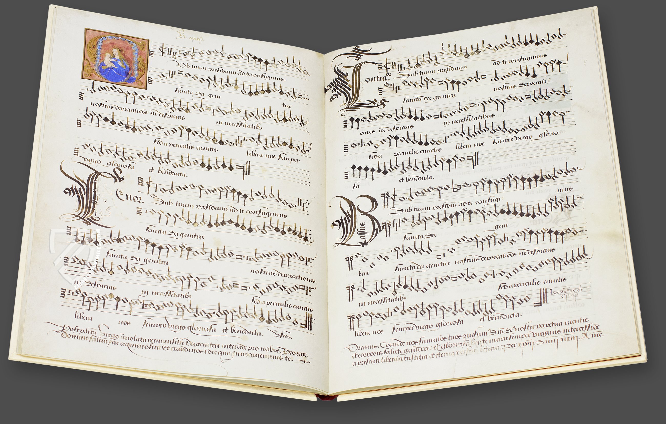 With a serene look on her face, the Virgin Mary holds a red rose between her thumb and index finger as the baby Jesus reaches out for it. They are surrounded by a light blue aura interrupting the letter, which is created with leafy embellishments. Using five-line staves, the musical notation of a motet dedicated to the Virgin by Benedictus de Opitiis is surprisingly modern with the notes indicating both melody and rhythm β a testament to the advanced state of 16th century English music.