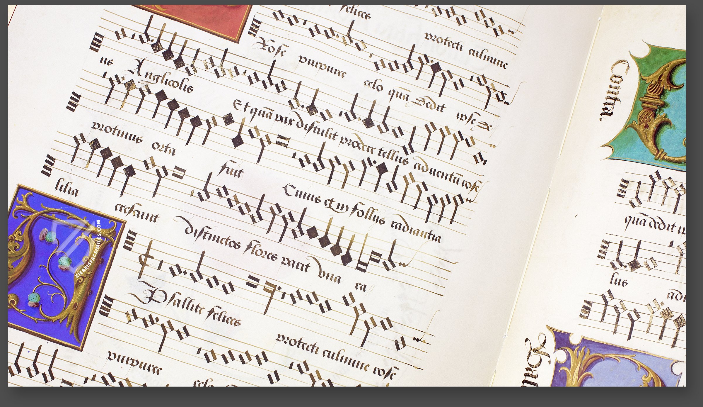 These musical pieces are also illustrated in a magnificently artistic manner on 36 pages of parchment measuring 49.5 x 34.5 cm. The gorgeously heraldic dΓ©cor with qualitatively outstanding miniatures makes the Royal Choirbook of Henry VIII an exceptional book! Among other decorations, a gorgeous frontispiece adorns the manuscript: three roses β one red, the red of Lancaster, a red-white rose as symbol of the unification of the houses of York and Lancaster, and a crowned rose as a symbol for the King Henry himself β adorn the page and a pomegranate tree symbolizes Henryβs spouse Catherine of Aragon. The red roses are found distributed throughout the entire manuscript and thus celebrate the Tudor dynasty, which is praised in the songs and honored in the miniatures!