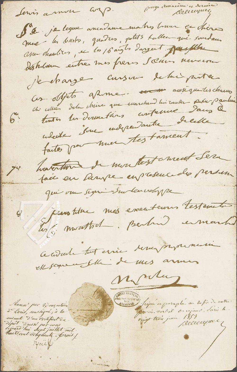 This example of the signature of one of the greatest generals in history appears on a small sheet that is part of his will’s addenda. The line above states that it was signed at Longwood House, the mansion on the Island of St. Helena where Napoleon spent the last years of his life, on the 23rd of April 1821, a little more than a week after the main body of documents were written. It appears alongside a modern stamp from the French National Archives, its modern repository, and an original wax seal with Napoleon’s coat of arm that has deteriorated to the point of being unrecognizable.