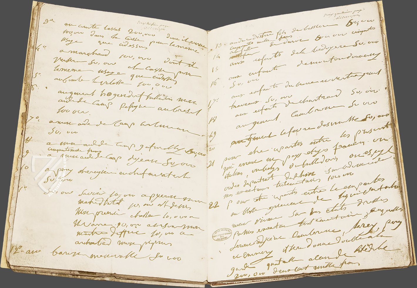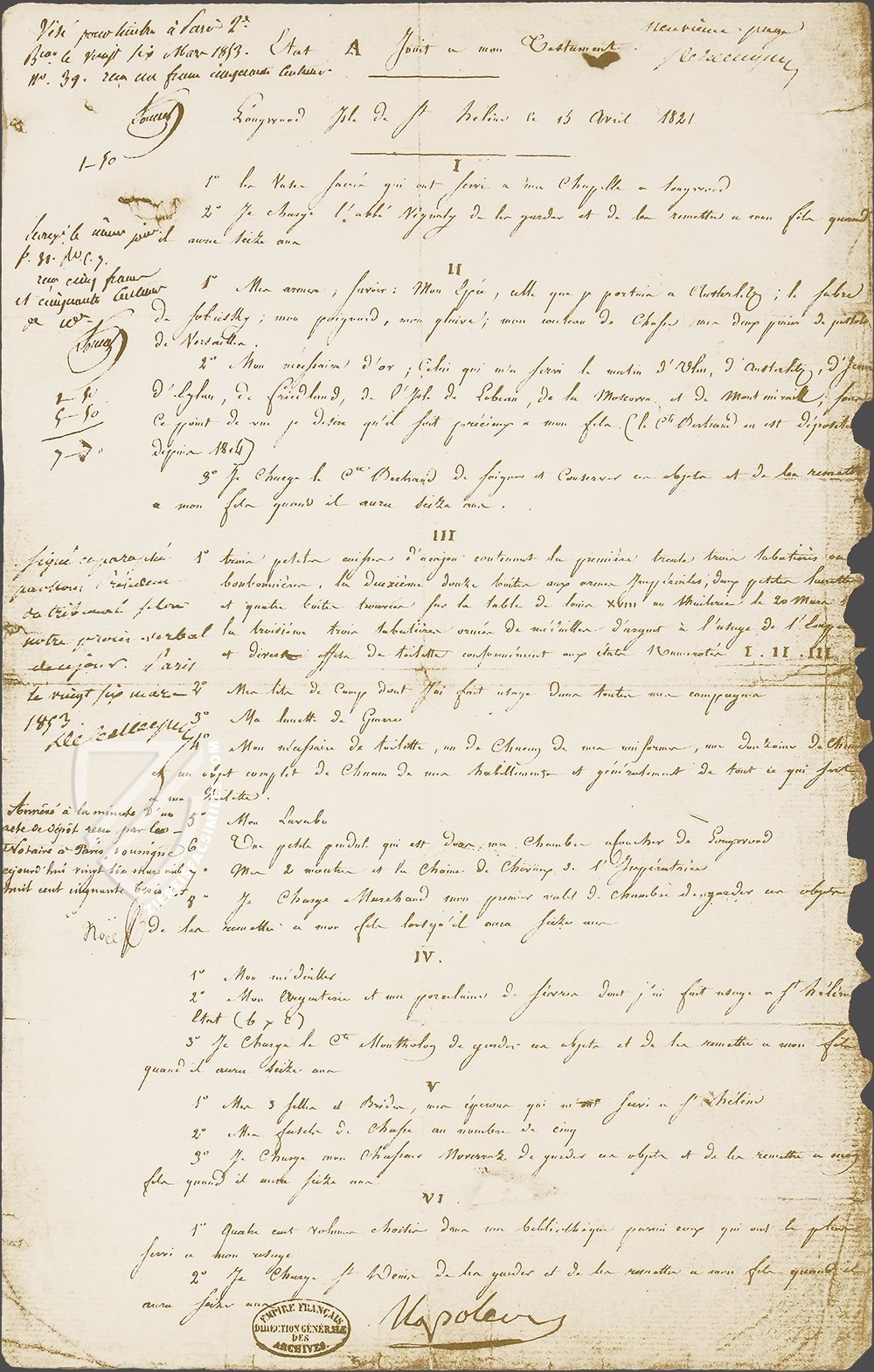 Few historical figures have attained the level of fame enjoyed by Napoléon Bonaparte (1769–1821), who is remembered as one of the greatest military geniuses of all time, and one of the most debated political legacies in history. His culturally legacy is enormous, but the document at hand is concerned with his personal legacy, that is to say his last will and testament. It was written on the British island of St. Helena in the middle of the South Atlantic, where he was exiled after his final defeat at the Battle of Waterloo on June 18th, 1815. It is written in his own hand, with several copies made by his assistant, General Charles Tristan, marquis de Montholon (1783–1853), in the event that the British would destroy the original. After initially making some patriotic statements and some personal statements addressed directly to various family members, he also takes the time to insult various people, from the governor of St. Helena, Hudson Lowe (1768–1844) to Tallyrand (1754–1838) to Lafayette (1757–1834). The will goes into great detail in describing how Napoléon’s assets were to be distributed among his family, family, servants, and the various generals who served him, or their families in case they were dead. He lists practically all of his personal property and to whom his personal property was to be distributed, from an alarm clock that once belonged to King Frederick II of Prussia (1712–1786) to his hand washing stand, complete with jug. Such was the former emperor’s generosity, that he even sought to disperse property that he did not own. The will truly reflects the self-image of the incredibly ambitious Corsican.