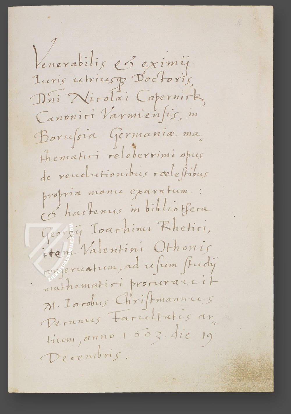 Held today in Cracow’s Jagiellonian University Library, the original manuscript of De revolutionibus has passed through many hands over the centuries and has an interesting ownership history. After Copernicus’ death, the manuscript was inherited by bishop Tiedemann Giese and later by Georg Rheticus, a doctor at the court of the King of Poland, Sigismund II Augustus (1520-72) in Cracow. After Rheticus’ death it was inherited by his student, Valentine Otho, who took it to Heidelberg where he was a professor of mathematics. After Otho’s death, the manuscript was bought by a professor of astronomy, Jacob Christmann. He had it bound and added a note about the author, which replaced the lost front page, and used parts of the manuscript in his own work about movements of the Moon in 1611.