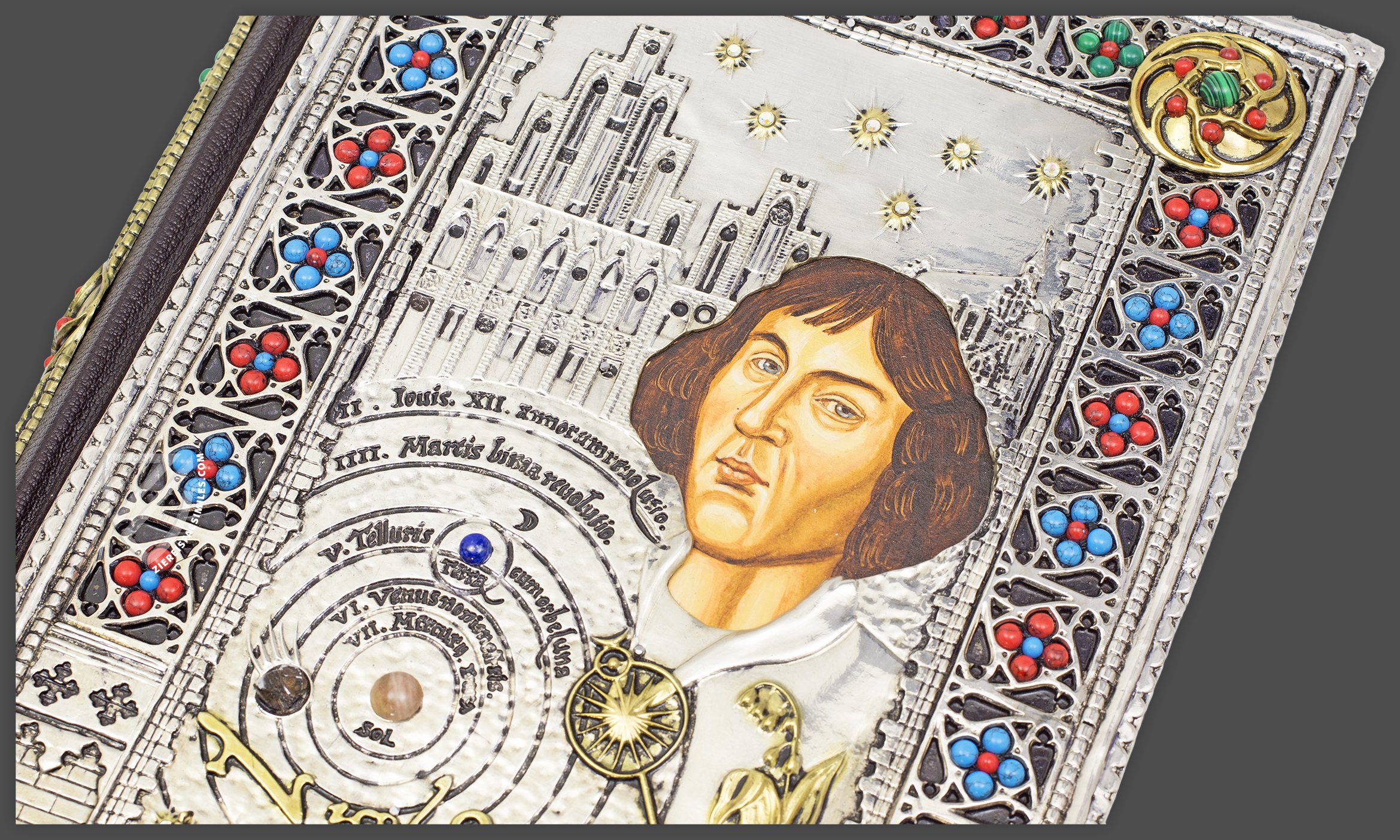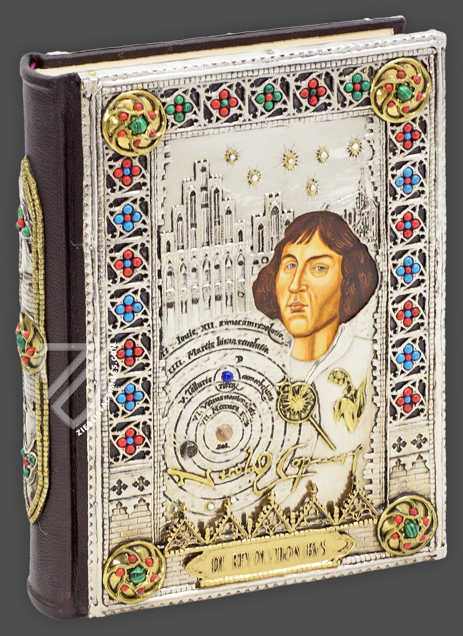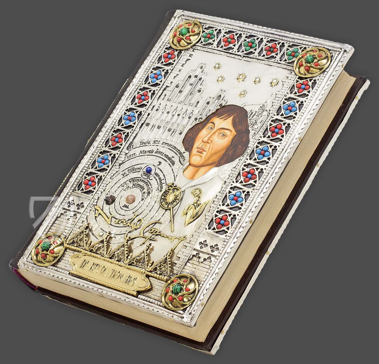 Few other treatises from the Middle Ages have been of such great significance for science, philosophy, mathematics, and the natural history of the universe as De revolutionibus. The magnum opus of Nicolaus Copernicus was the work of more than 30 years of labor and the original manuscript from the hand of the genius is presented here, which finally made its way back to Cracow after a tumultuous ownership history. The unbelievably influential text is a milestone in the astronomy of the modern era. It provoked a revolution in the thinking of the medieval population and was an absolute standard work of science until the late 18th century. This groundbreaking treatise is housed in a luxury binding consisting of gold and silver, 320 gemstones including turquoises, corals, malachite, lapis lazuli, sunstone, and Swarovski crystals as well as a fragment of the Muonionalusta meteorite, which was discovered in Sweden in 1906. The décor includes a portrait of Copernicus and a depiction of his heliocentric model.