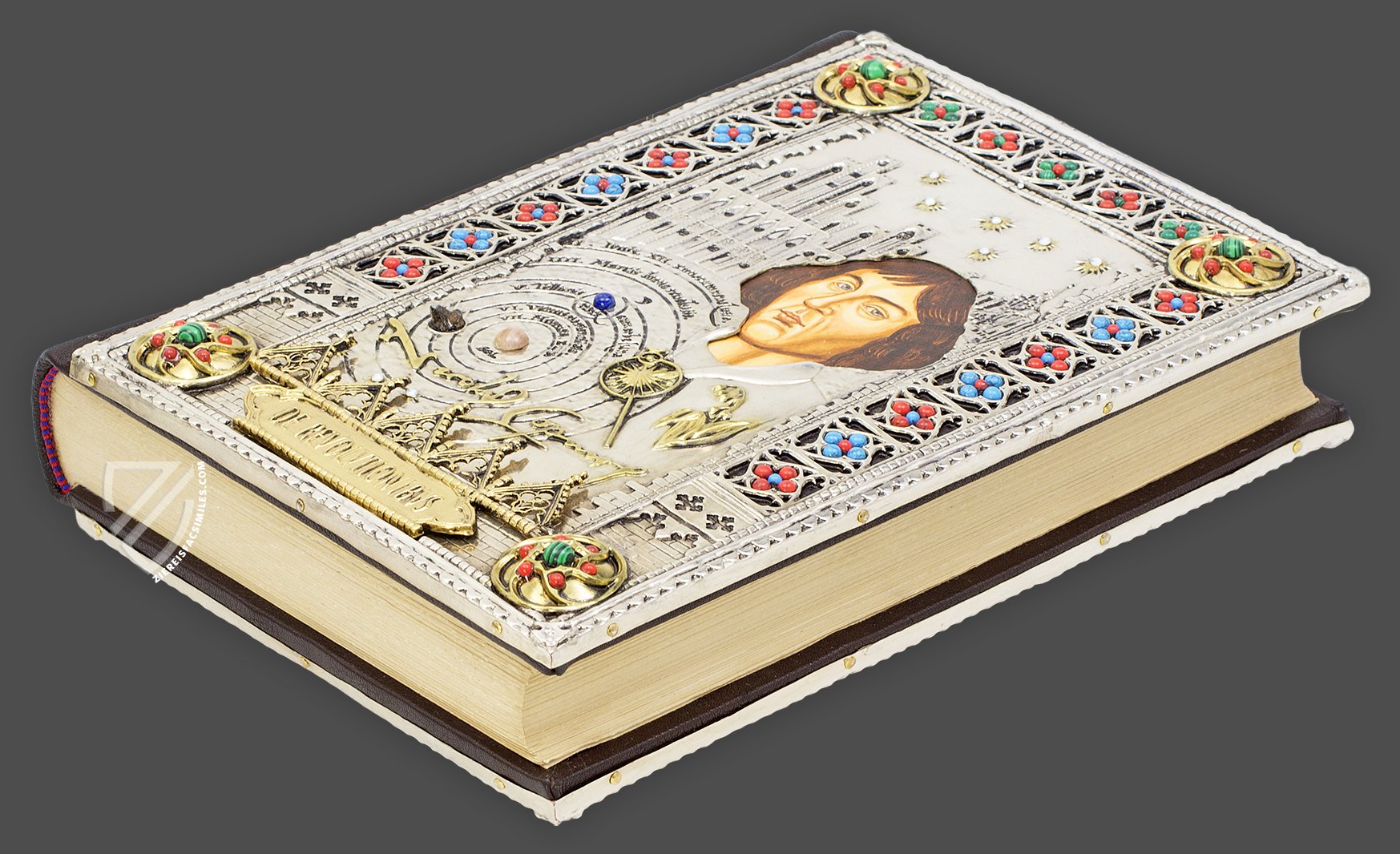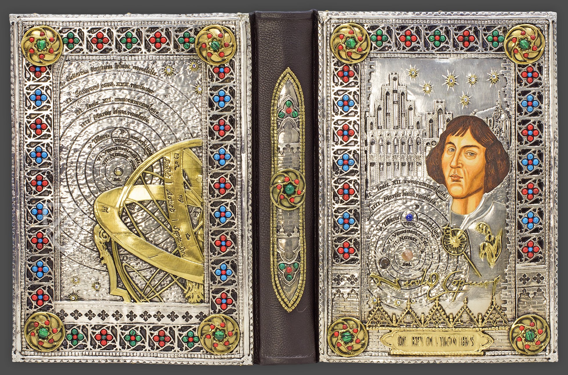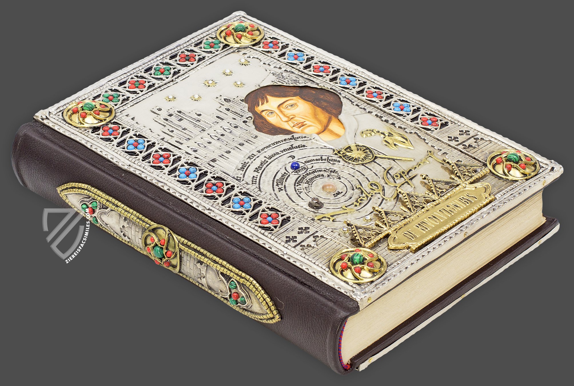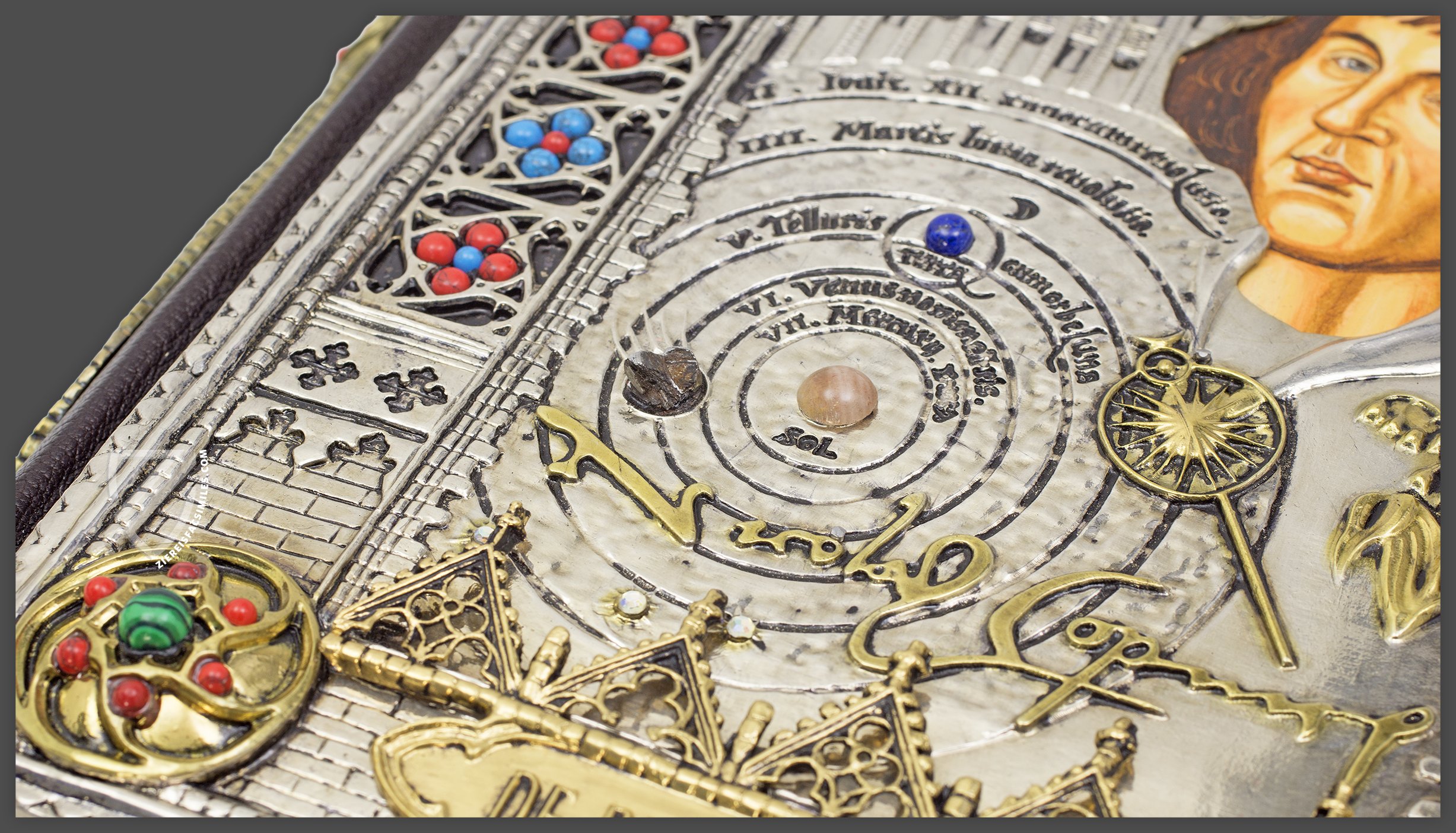 Few other treatises from the Middle Ages have been of such great significance for science, philosophy, mathematics, and the natural history of the universe as De revolutionibus. The magnum opus of Nicolaus Copernicus was the work of more than 30 years of labor and the original manuscript from the hand of the genius is presented here, which finally made its way back to Cracow after a tumultuous ownership history. The unbelievably influential text is a milestone in the astronomy of the modern era. It provoked a revolution in the thinking of the medieval population and was an absolute standard work of science until the late 18th century. This groundbreaking treatise is housed in a luxury binding consisting of gold and silver, 320 gemstones including turquoises, corals, malachite, lapis lazuli, sunstone, and Swarovski crystals as well as a fragment of the Muonionalusta meteorite, which was discovered in Sweden in 1906. The décor includes a portrait of Copernicus and a depiction of his heliocentric model.