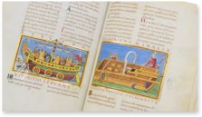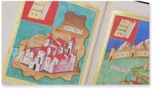 The Madrid manuscript originated in Italy. The Italian humanists of the 15th century concerned themselves extensively with political and cosmological treatises. The texts in this manuscript are true to the originals and are gorgeously illustrated with over 100 miniatures. These are obliged by the respective taste and style of the text’s period of origin. Therefore, one finds elegant Gothic miniatures and lavish Renaissance adornment, but also schematic charts in the tradition of the Early Middle Ages, or well-arranged tables. Ancient personalities on coins, personifications and symbolic depictions of cities and regions, as well as other depictions illustrate the historically significant text of this manuscript!