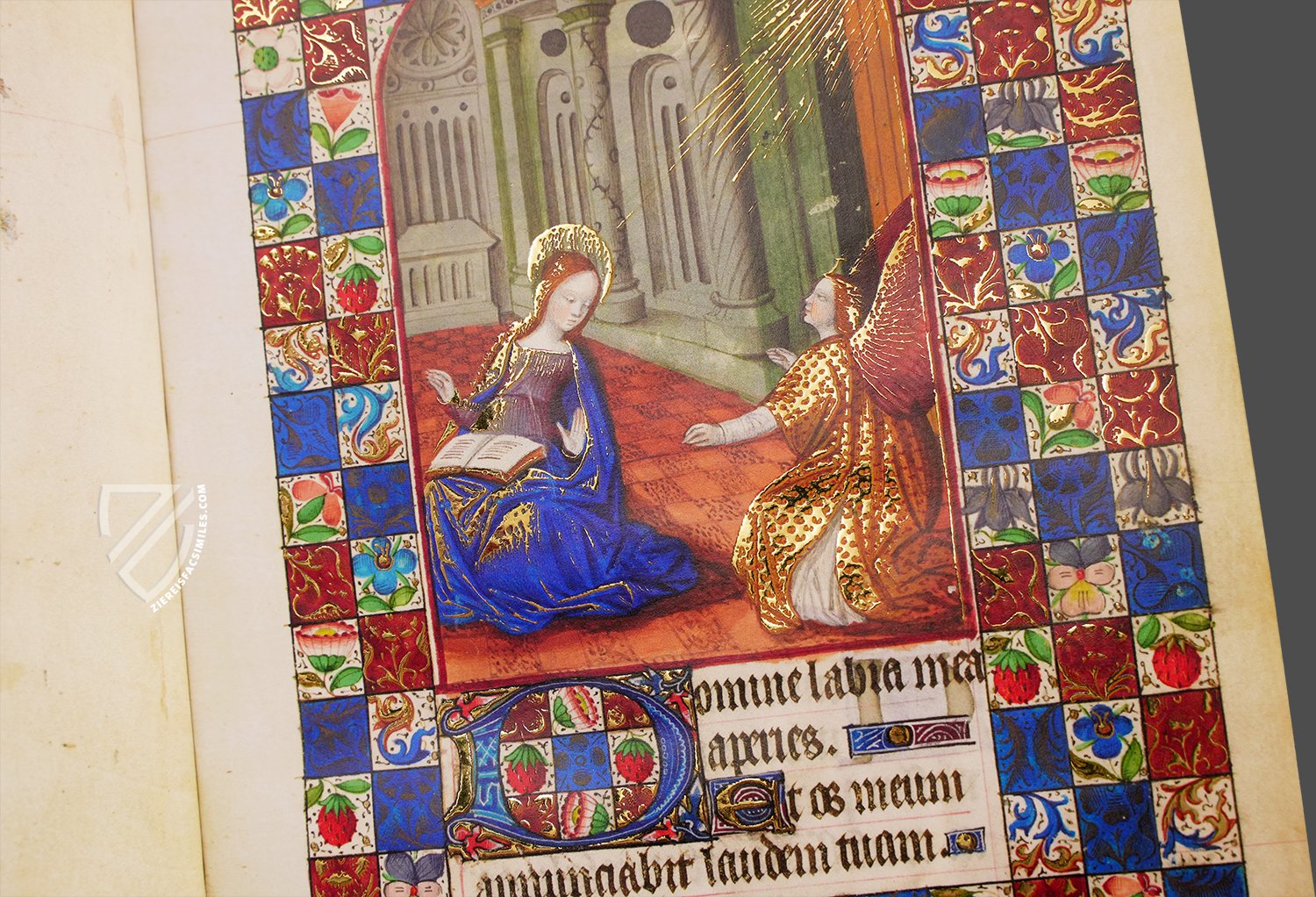 A gorgeous depiction of the Annunciation is illustrated in the Officium: Mary, kneeling on a pillow in prayer, and the arch angel, who is delivering the good news with a banderole, are in an artfully-composed space with asymmetrical checkered floors, ornamented walls, and a green canopy over the lectern, before which Mary kneels. God the Father watches over the scene from the upper left corner of the image. Finally, a vase with two white lilies as a symbol of Maryβs virginity stands in the center of the room.